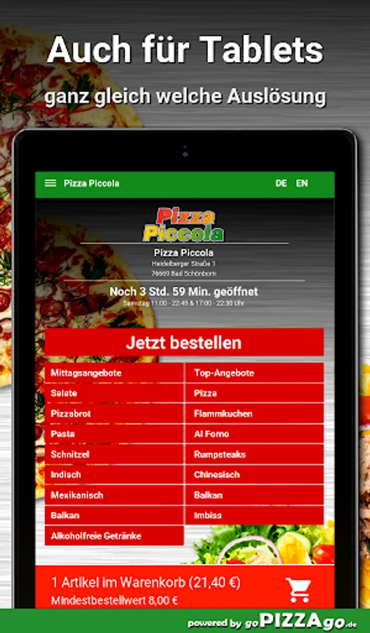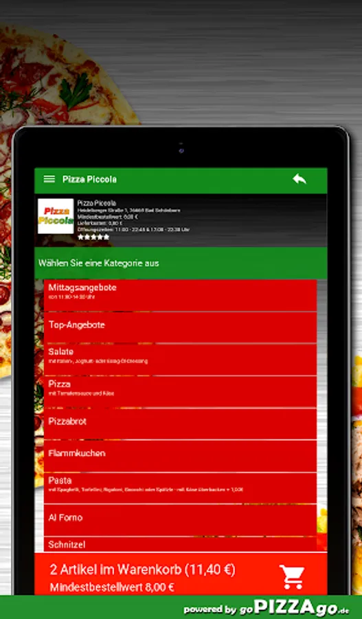 You can order and pay for this online from our deliciously fresh selection of feasts at our Pizza Piccola pizza service. Choose from a range of 145 dishes & drinks such as sheep's cheese casserole, pizza diavolo, garlic bread, mexican salad, Florida salad, chicken korma. You can also order drinks such as still water, Sprite, Mezzo Mix, Fanta, Coca-Cola light, Coca-Cola. We also offer inexpensive lunch specials: Lunch special - Schnitzel.The top 7 hits at our placePizza Piccola is open at the following times