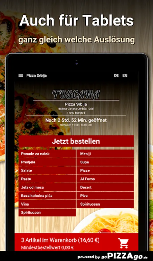 You can, of course, order a large number of dishes from us here in our online shop. A great selection of 66 delicious dishes such as vegetarian lasagne, Wan-Tan, Palačinka Eurokrem, Stuttgarter Hofbräu Pilsner and vegetarian lasagne for €9.90. Our popular items are When we deliver your food