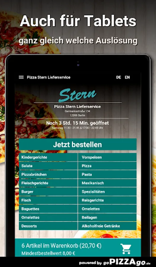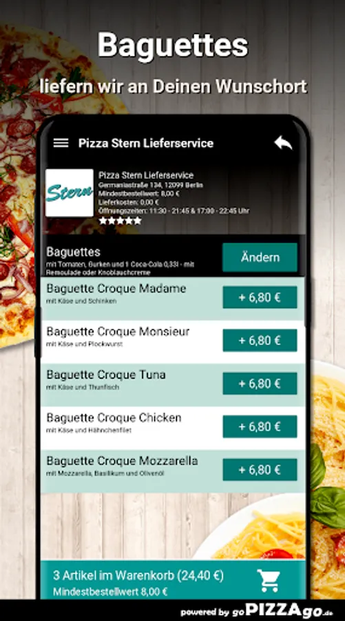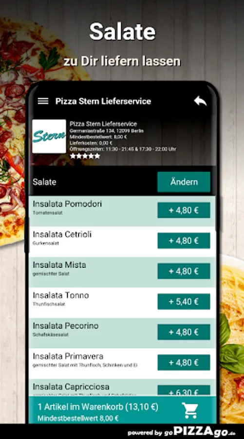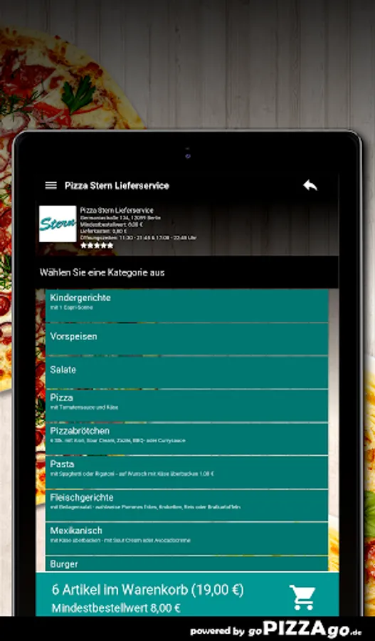 You can of course order numerous dishes from Heimservice Pizza Stern Delivery Service (12099 Berlin) and have them delivered to your office or home. We offer you more than 166 freshly prepared dishes. You can also order drinks, we have Coca-Cola light, cherry nectar and mineral water. Would you also like to have something delivered for boys and girls? We have Scaloppa Bambino, Pizza Bambino, Spaghetti Bambino on offer. The most popular delicaciesWhen we bring your food