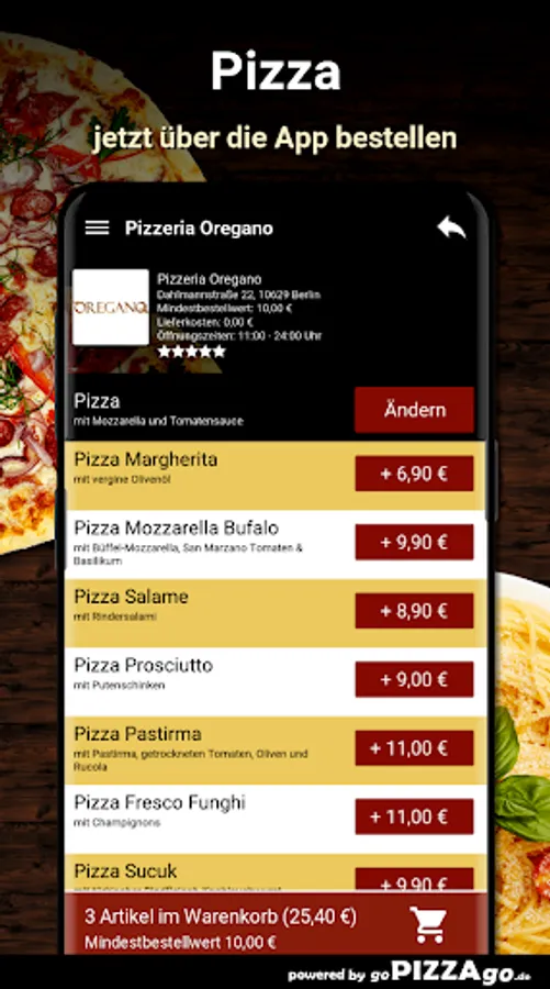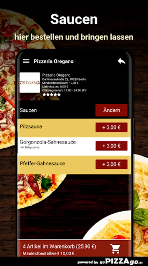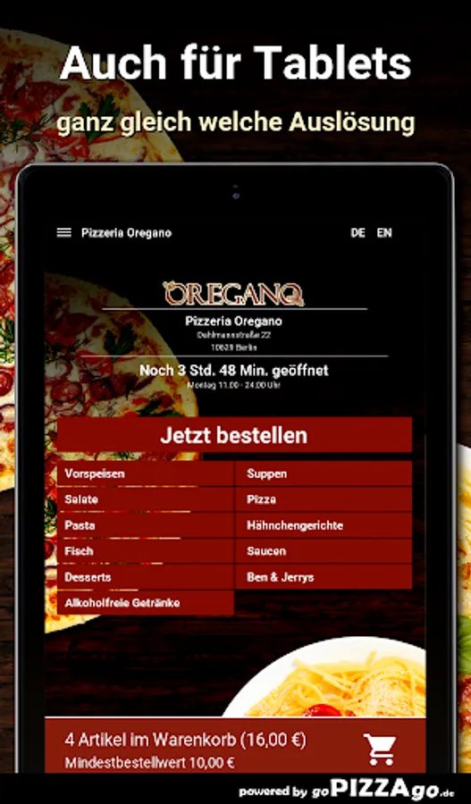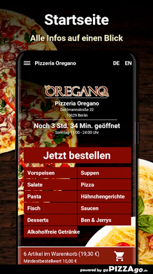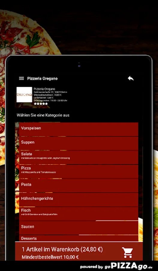 Frisches & leckeres Essen kannst Du beim Lieferservice Pizzeria Oregano (10629 Berlin) ordern und in Dein Zuhause oder vielleicht auch das Büro liefern lassen. Unser Online-Angebot umfasst mehr als 84 Essen oder Getränke, ein Auszug: Pizza Amore, Mozzarella-Brot, Spaghetti Verdura, Tagliatelle Formaggi, Pizza Mozzarella Bufalo, Tagliatelle Pesto für 9,00 €. Wir liefern weiterhin Erfrischungsgetränke wie San Pellegrino, Mezzo Mix, ViO still, Red Bull, Sprite, Coca-Cola light.Was sind unsere TopsellerUnsere Lieferzeiten sind