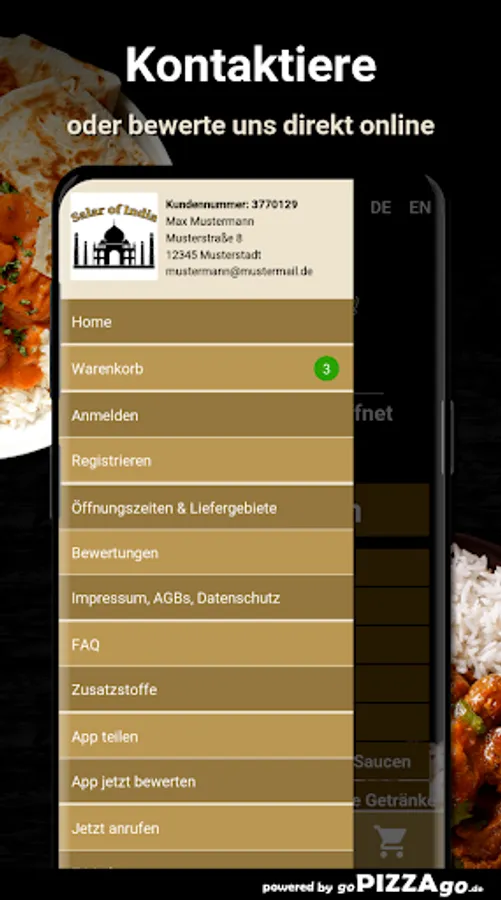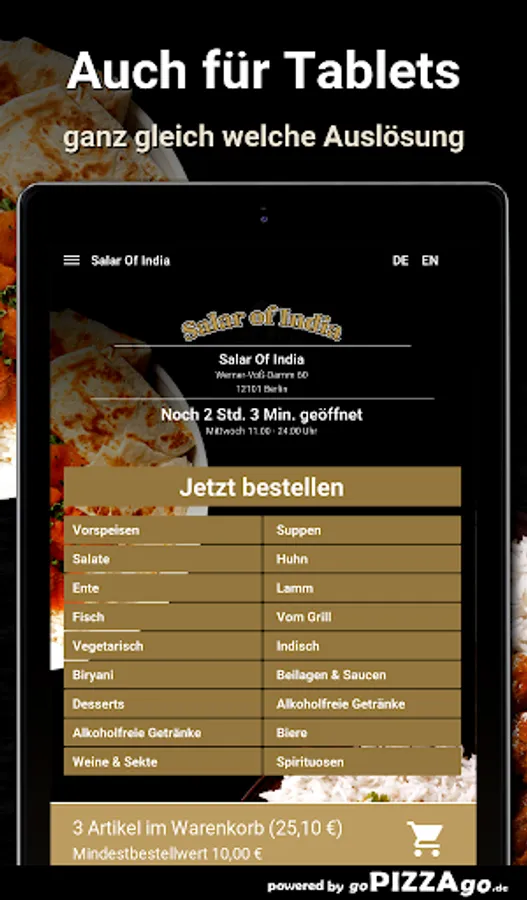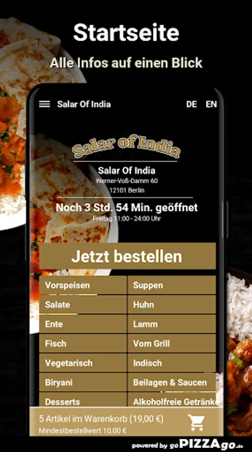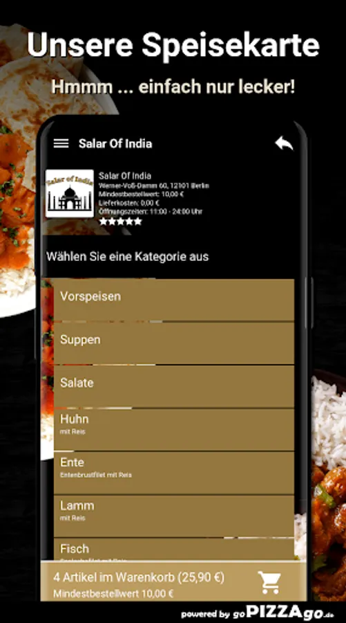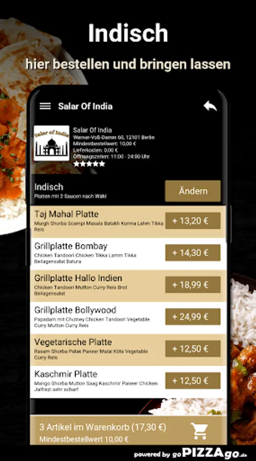 You can quickly order tempting meals from our delivery service Salar Of India in Berlin and maybe have them brought to the office or home. A range of 161 delicious dishes awaits you. Our most popular specialties areWhen does Salar Of India deliver?