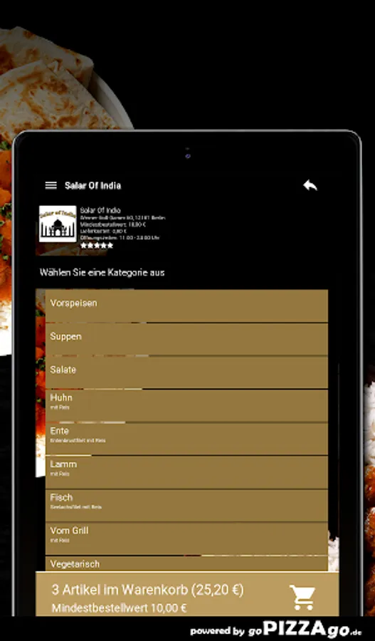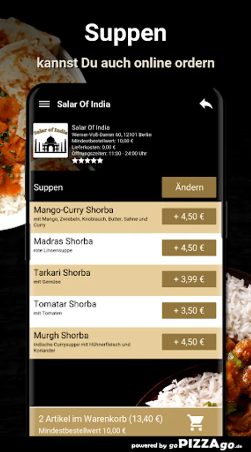 Welcome to Salar Of India in Berlin At Salar Of India you can order duck, grilled, soups, chicken, Indian, salads here and have them delivered.