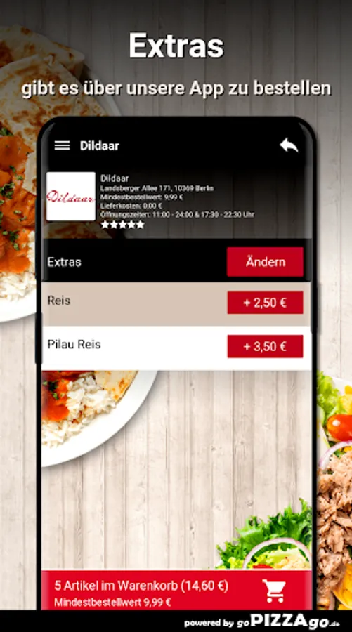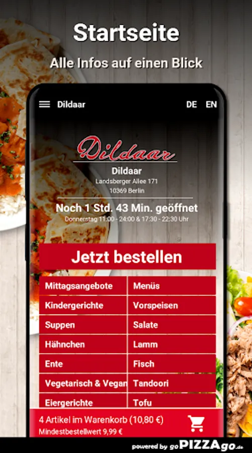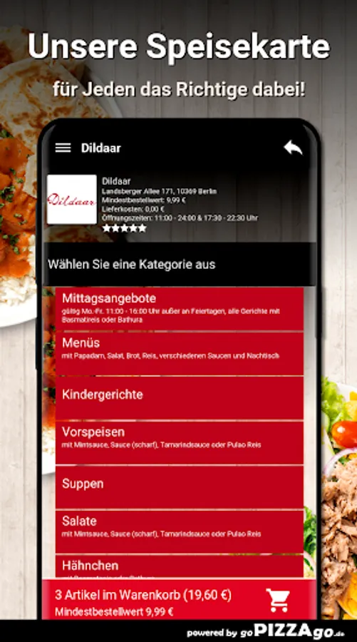 You can safely order many freshly prepared specialties from the Dildaar delivery service (10369 Berlin) and have them brought to the office or home. You will find over 249 fresh dishes in our menu. Look out for the delicious dishes for girls and boys, such as Kinder Sabzi Korma, Kinder Chicken (mild). For lunch we have Aloo Vindaloo, Chicken Tikka Tandoori, Butter Chicken, Paneer Vindaloo, Chicken Himalaya. Our popular items are the opening times