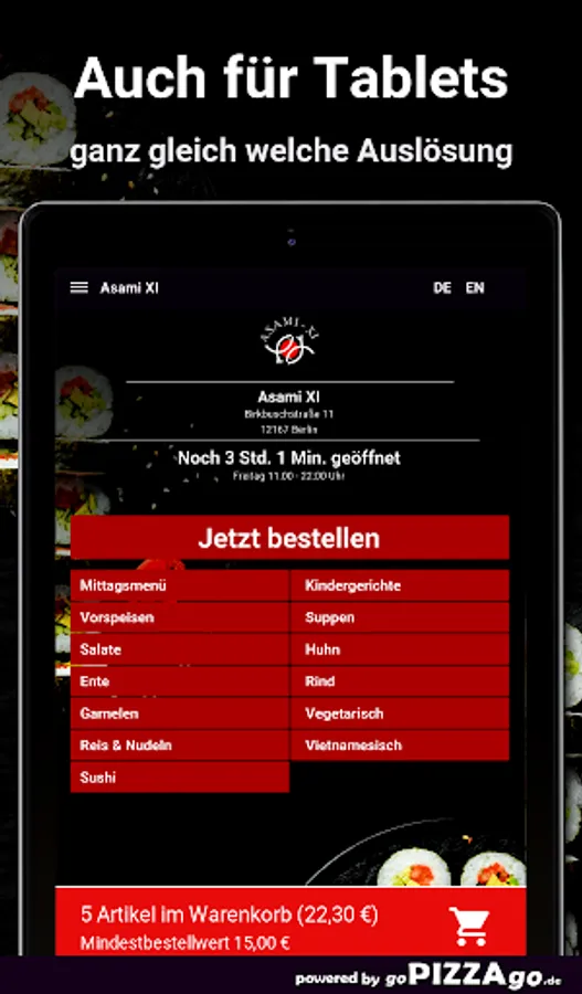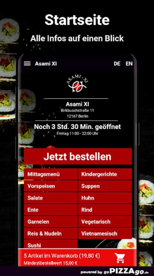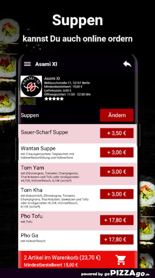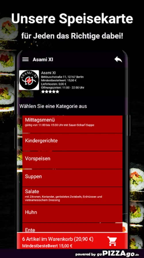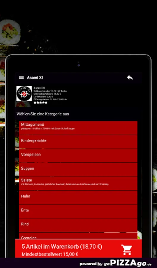Welcome to Asami XI in Berlin. Are you up for beef, sushi, starters, duck, chicken, rice & noodles, soups, shrimp to order online?