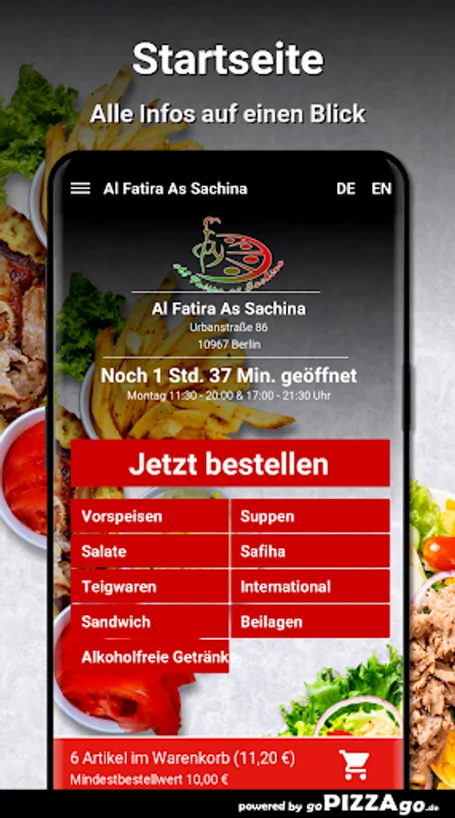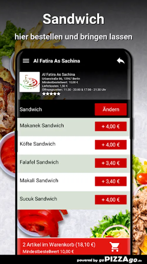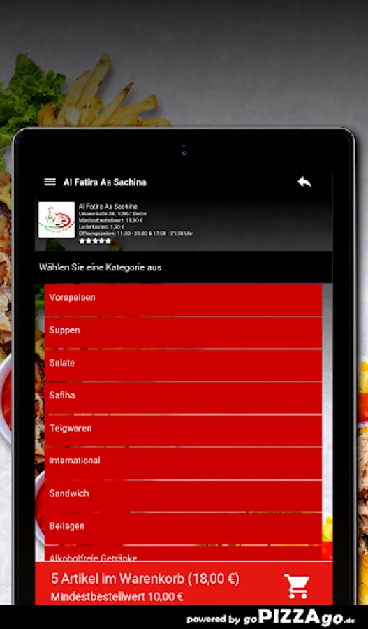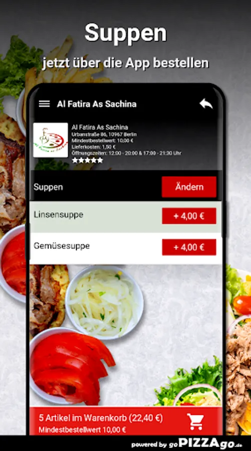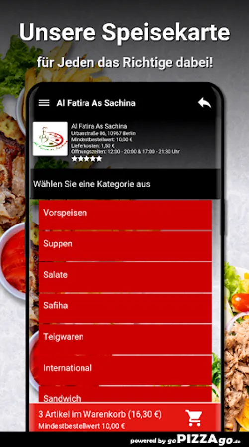 Crunchy, juicy salads from the Al Fatira As Sachina delivery service You can get crispy fresh salad for € 4.00, Al Fatira As Sachina has chicken salad for just € 6.80 & taboules are available for € 4.60. We are looking forward to your visit! Al Fatira As Sachina