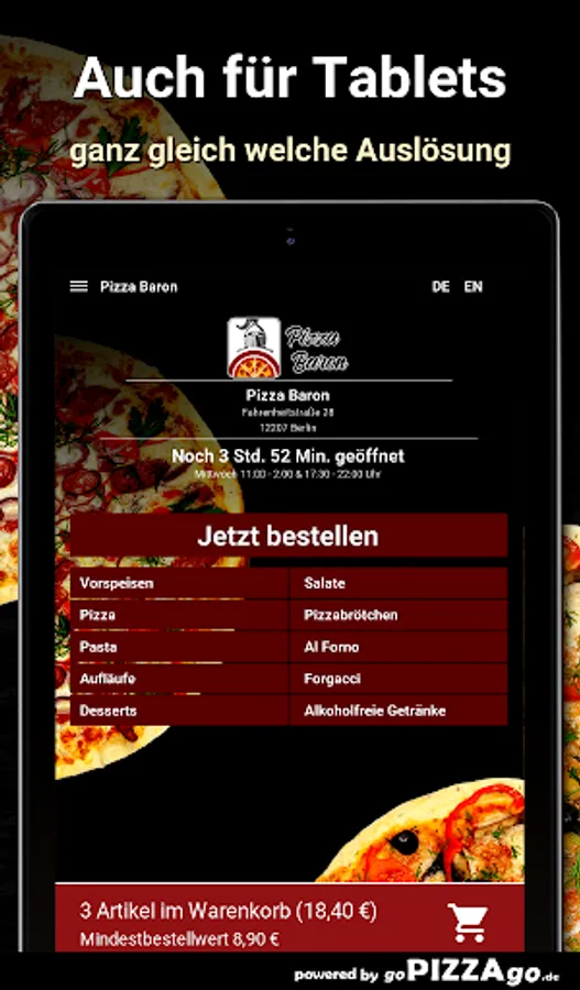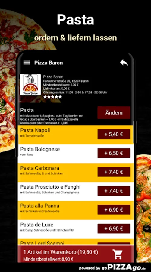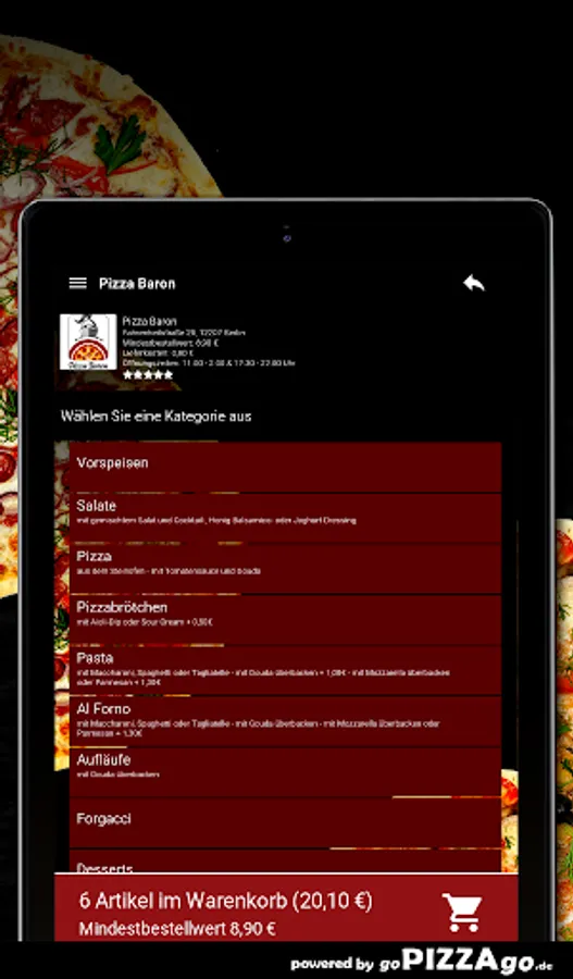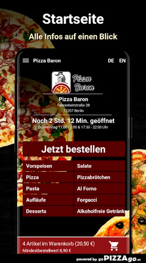 Cooking with dedication - enjoy the cuisine of Italy from the home service Pizza Baron46 absolutely delicious dishes from Italy are available online here from Pizza Baron. Pizza El Chapo is available online for only € 8.40-11.90, delicious pasta Spinaci al Forno is available for € 7.40, Pizza Tonno for a fabulous € 7.40-10.40, Pasta Chef al Forno.
