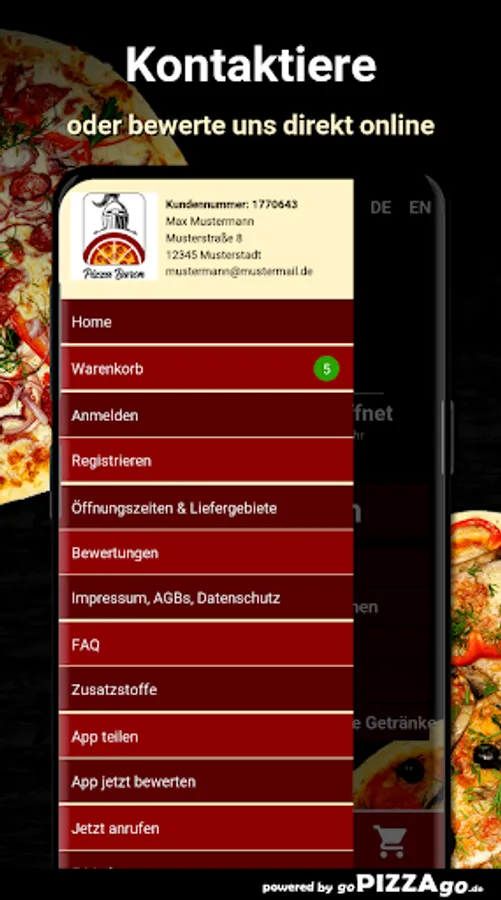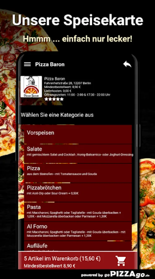 You can order and pay for delicious food ... really freshly prepared online in our pizza service. With us you have a selection of over 84 freshly prepared dishes such as pasta chicken broccoli, pasta lord scampi, 6 pizza rolls filled with spinach and herder cheese.
