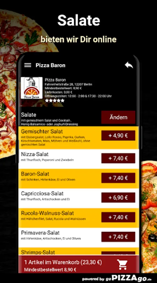 Fresh & vital: salads at Pizza Baron pizza delivery service The salad creations at Pizza Baron are a healthy experience. We offer you 10 salads. best rocket-walnut salad to the delivery location of your choice, crisp Baron salad € 7.40, healthy California salad, healthy special salad is brought to you for € 7.90, young and crisp Nice salad.
