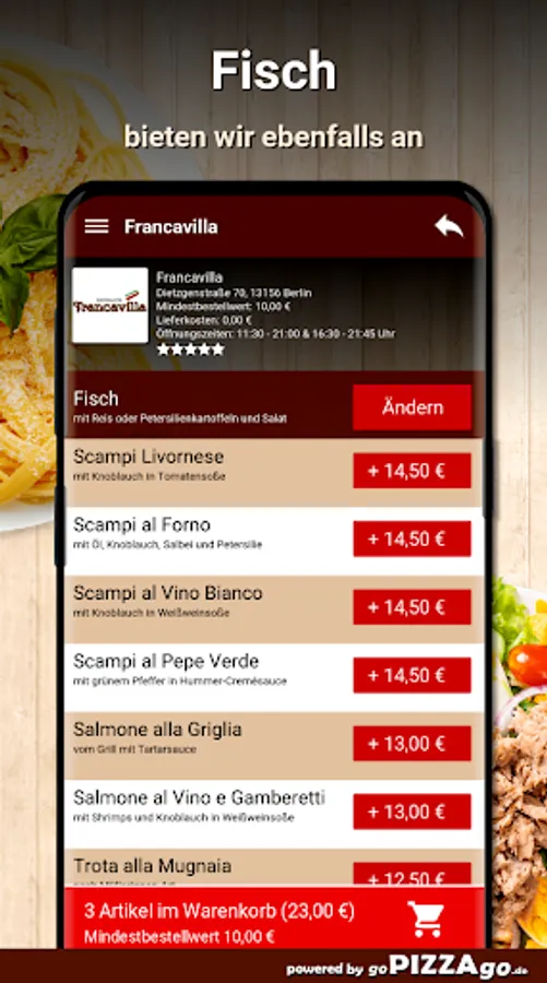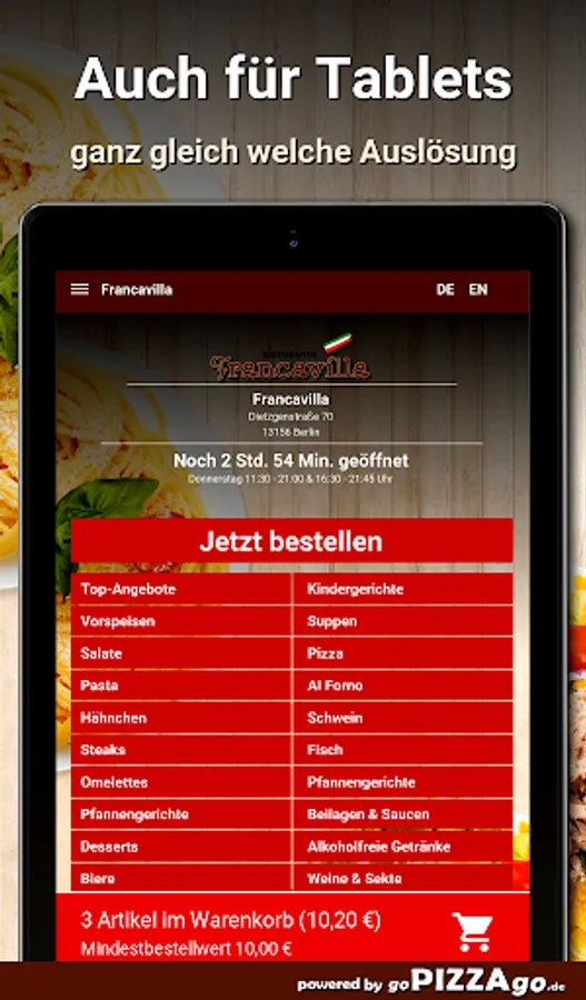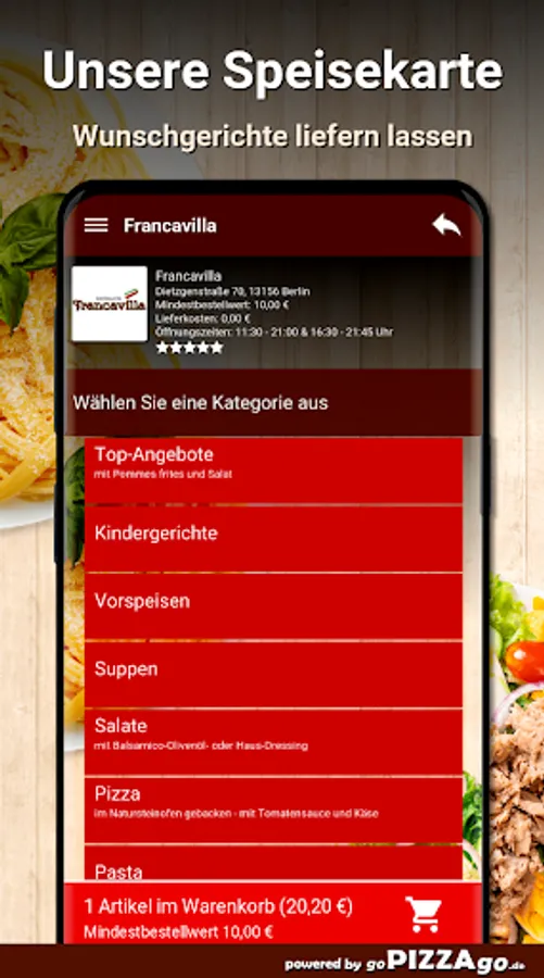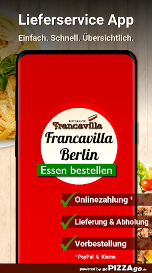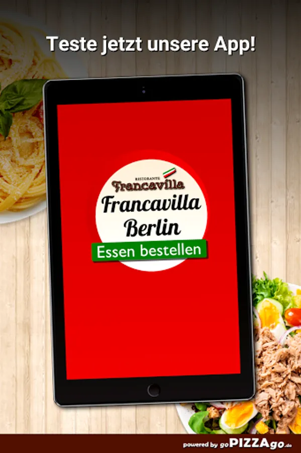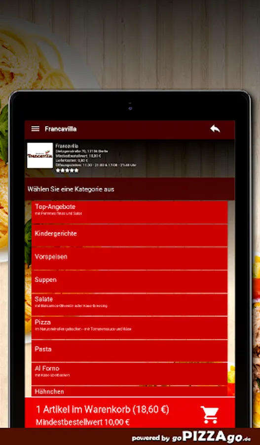 You can safely order from our delivery service Francavilla in Berlin from a large selection of food or drinks & have them delivered to your office or home. We have 148 dishes for you, including Pizza Funghi, Pizza Parma, Green Beans, Verdura Mista Gratinati, Pizza Calabrese. We also have a wide range of drinks to choose from: Coca-Cola, Fanta, Sprite. For kiddies we have Pizza Bambino, Scaloppa Milanese Bambino, Children's Spaghetti Bolognese on offer. We are very happy to order these.We deliver at these times