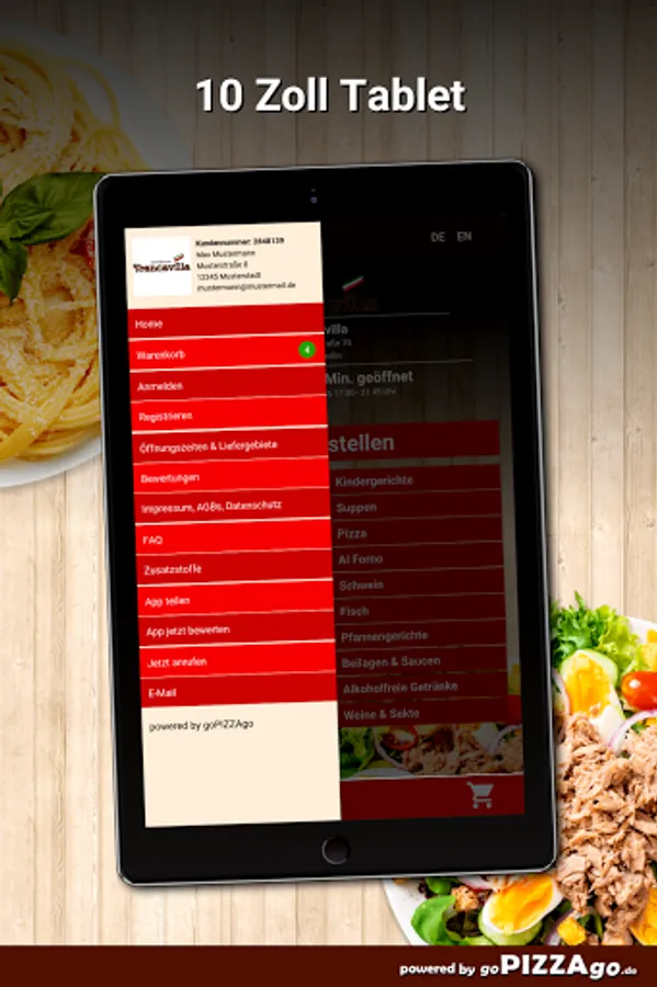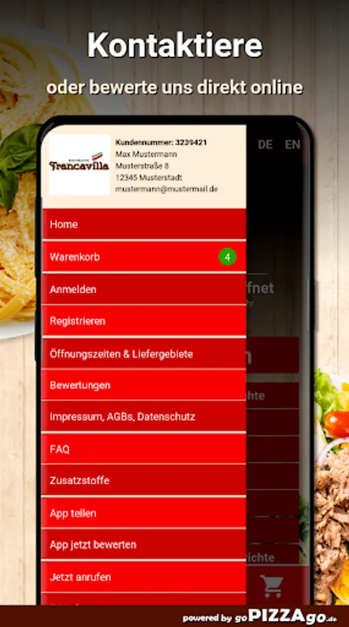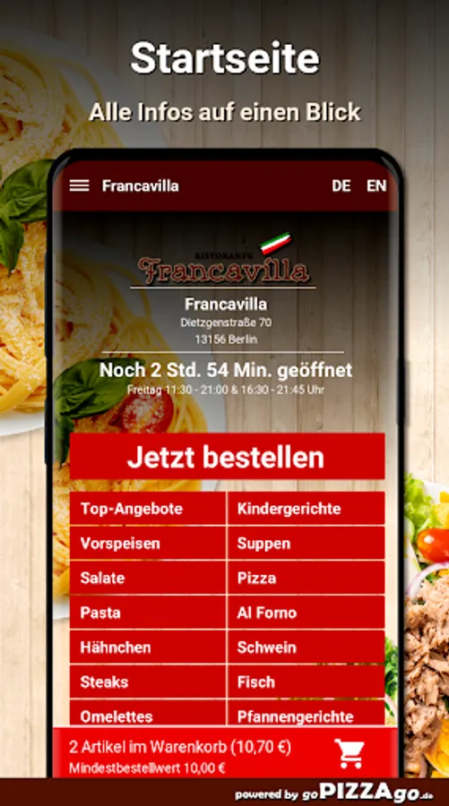 With Francavilla, Italian cuisine offers you many delights52 absolutely delicious dishes from Italy are also available here from Francavilla. Spaghetti Francavilla for a fabulous 8 euros to take home or to the office, Pizza Prosciutto, Pizza Calabrese are available here online for just 7.50 €, the most exquisite Spaghetti Napoli with tomato sauce. Spaghetti Bolognese, Antipasto Frutti di Mare can be delivered to your home for € 7.00, delicious Rigatoni con Pollo directly to your front door and Mozzarella Caprese. We are looking forward to your visit! Francavilla
