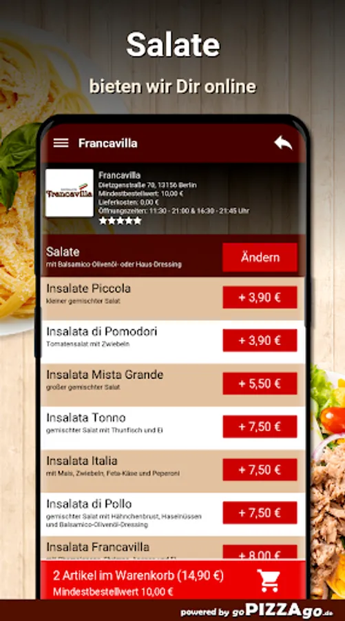 Salads in Berlin from Francavilla: delicious mouth-watering and healthy food is also available online here: 8 mouth-watering salads are available online with Francavilla: Insalata Francavilla for € 8.00, Insalata di Pomodori can be delivered for € 3.90, Insalata Mista Grande, Insalata Italia is brought to you for € 7.50, Insalata di Rucola can be ordered for € 7.50, Insalata di Pollo is brought to you for € 8.00, Insalata Tonno is available for € 7.50 and Insalate Piccola is available for 3.90 euros.