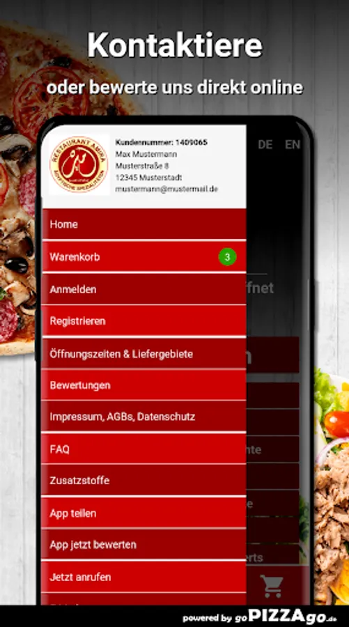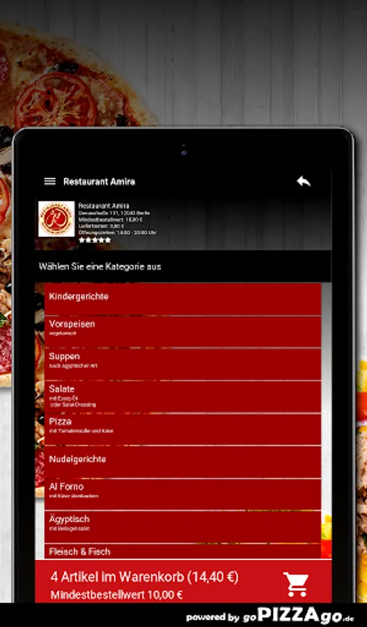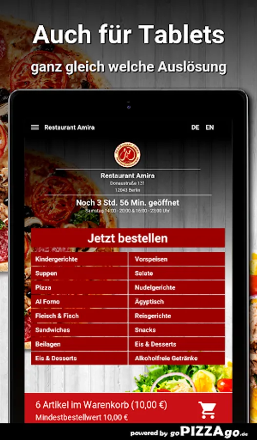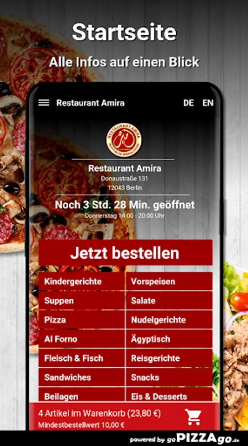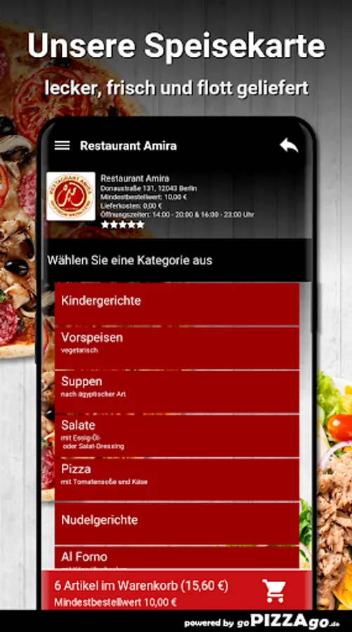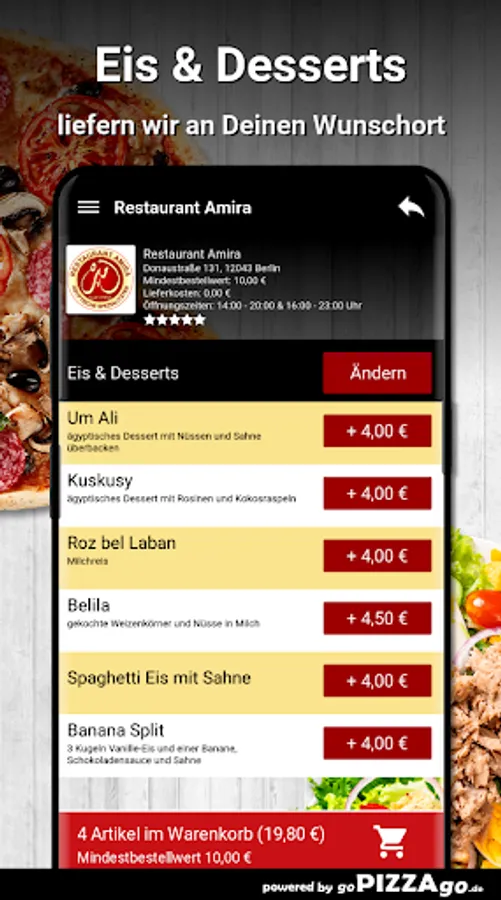 At Restaurant Amira you can order pizza, starters, soups, Egyptian, rice dishes, meat & fish, pasta dishes and snacks easily online.