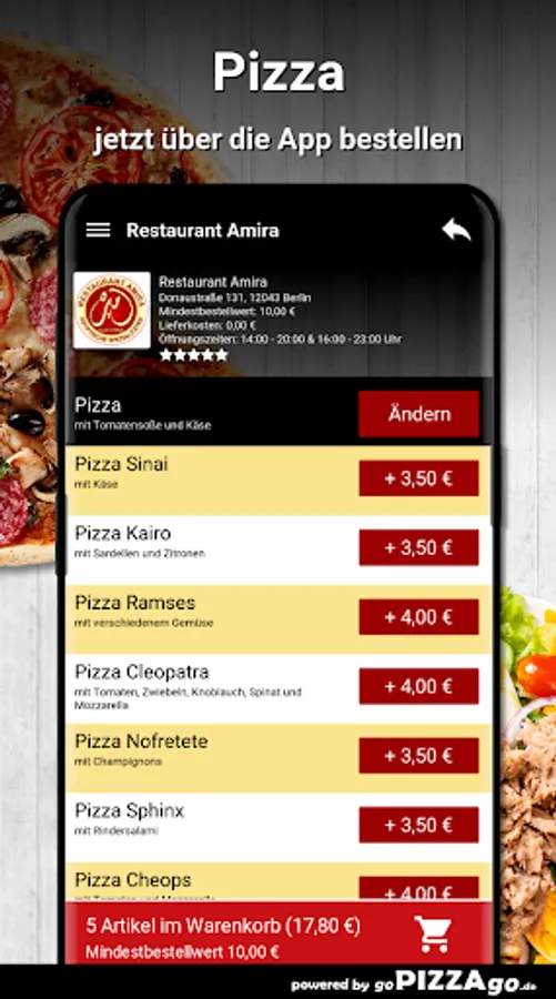 Restaurant Amira has pizza Luxor or Pizza Alexandria for just € 5.00.