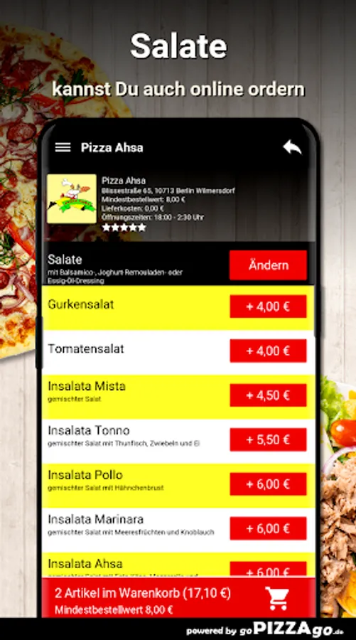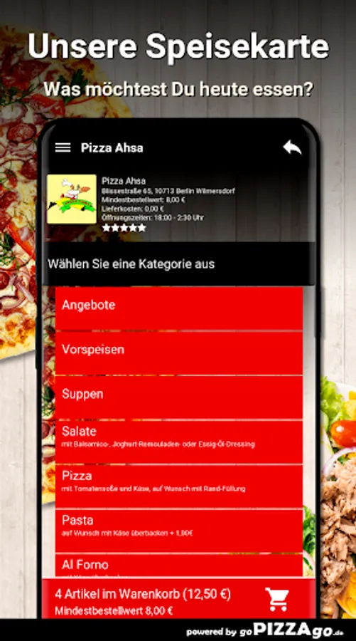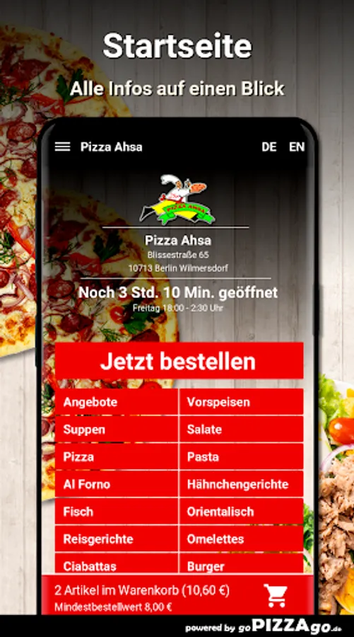 You can easily order freshly prepared food from our Pizza Ahsa pizza service here. We have 172 meals, an excerpt: Mozzarella Caprese, Pizza Mexikana, Country Potatoes (small), Kafta al Forno, Insalata Pecorino. When does Pizza Ahsa deliver?