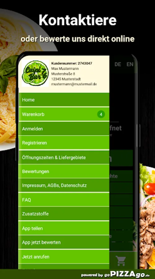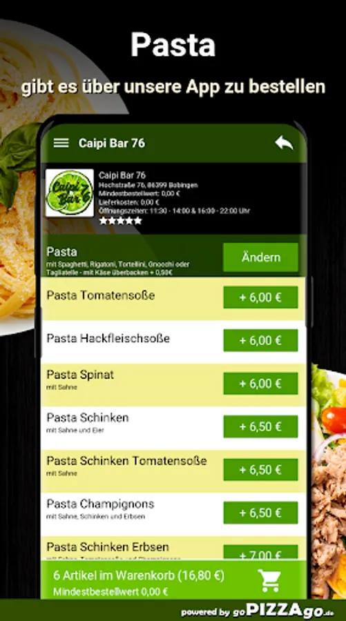 Pasta minced meat sauce can be ordered for 6 €, pasta ham and tomato sauce. You can order pasta ham online for just € 6.50, order pasta spinach online for just € 6.00, order pasta ham, peas with spaghetti, rigatoni, tortellini, gnocchi or tagliatelle - + 0.50 Caipi Bar 76 has € 7 for just € 7. Lovingly prepared pasta tomato sauce € 6, pasta crabs are available here online for just € 7, wonderfully seasoned pasta with four different types of cheese can be delivered to your place of residence for € 7.00.