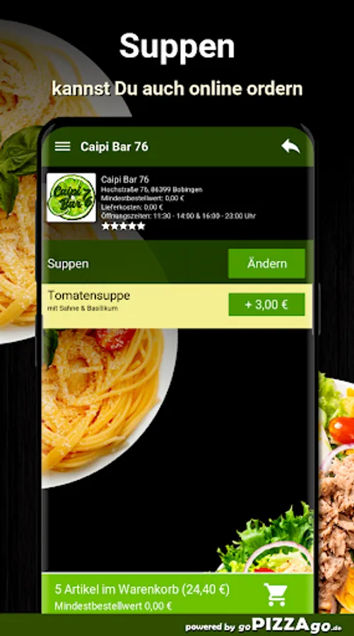 You can easily order a lot of food and drinks in our shop online. Choose from 113 freshly prepared dishes (pizza salami mushrooms, pizza bread, french fries, pizza sucuk, pasta ham peas, chicken biryani). Of course we also have delicious feasts for girls and boys such as a children's menu for EUR 9.50. After dinner we suggest a dessert: Greek galactoboureko, Indian rice pudding, Greek yoghurt Our popular items are When can I order from Caipi Bar 76?