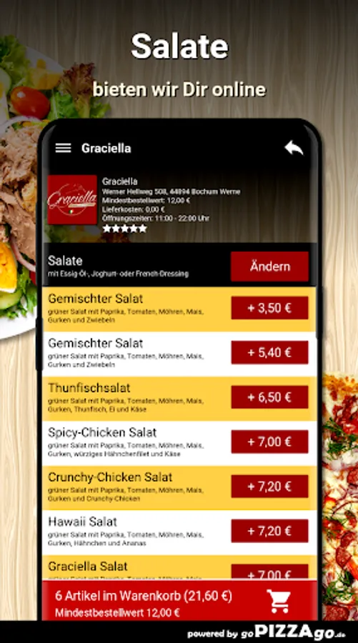 You can order and pay for many dishes in our online shop at our Graciella delivery service in Bochum Werne. Our online menu has more than 146 delicacies (half chicken, currywurst with French fries, mozzarella salad, tuna salad or mozzarella salad for EUR 6.00). We are happy to order this from us when we deliver your food