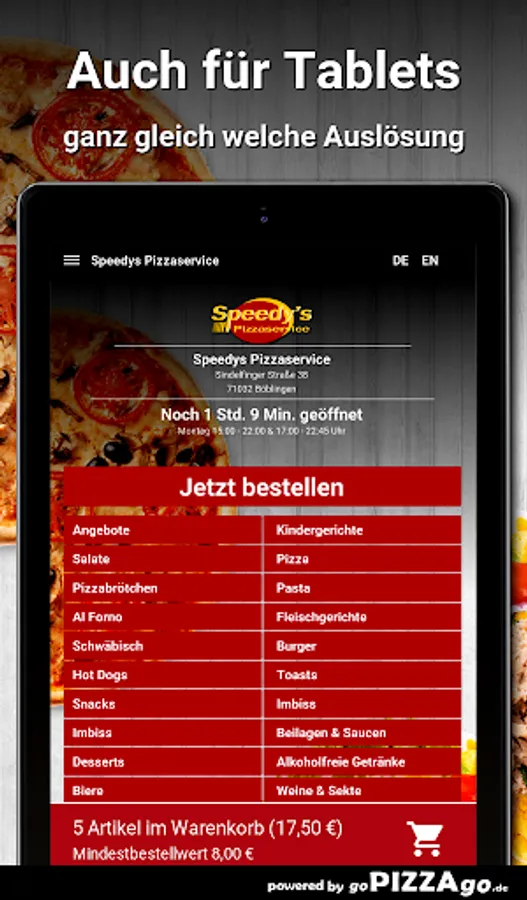 Hungry for pizza in Böblingen? Then you have come to the right place at Speedy's pizza service.We offer you delicious pizzas made according to traditional recipes online. Pizza Sunshine 10.00-27.50 euros, spicy Pizza Mexico with pizza sauce, Gouda and Italian spices 10.00-27.50 €, very good pizza prosciutto is delivered to your home at a price of 7.50-24.00 € or anywhere else as well as Pizza Stockholm you can get Speedy's pizza service for only 9.50-26.00 €.