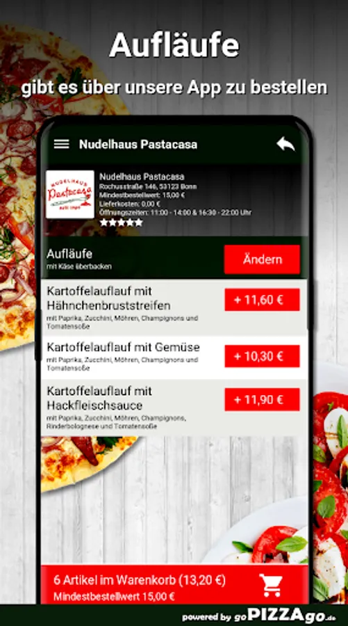 With cheese gratin there is a wide variety of variations at Nudelhaus Pastacasa in Bonn, with 4 gratinated oven dishes that you can order online here. You can get Casa Bella delivered to your place of residence for € 10.40, lasagna can be delivered wherever you want at a price of € 10.40, potato casserole with minced meat sauce can be delivered to your place of residence for € 11.90 and potato casserole with vegetables is brought to you for 10.30 euros.