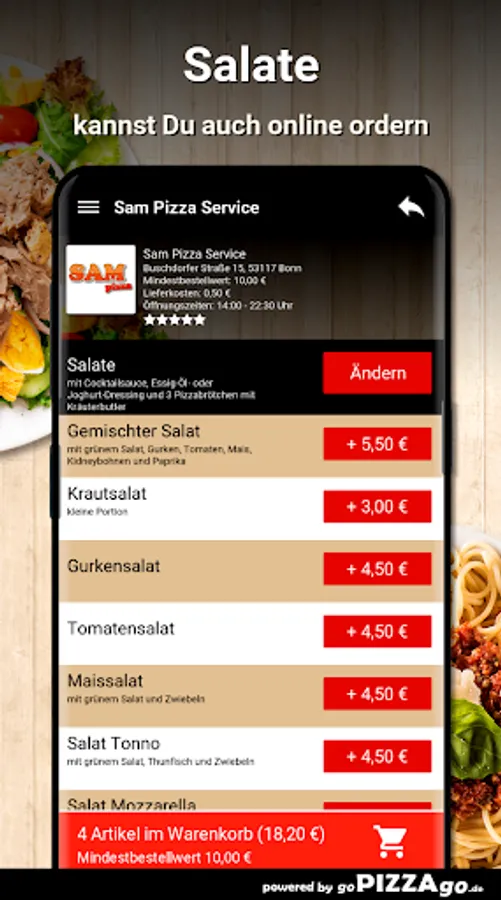 Salad tour for the health-conscious in Bonn? Sam Pizza Service makes it possible! With Sam Pizza Service you can of course also get your gourmet tastes as a salad gourmet. Mixed salad is available online for just 5.50 euros, young and crunchy mozzarella salad is available for 7 euros. Salad Tonno with cocktail sauce, vinegar, oil or yoghurt dressing and 3 pizza rolls with herb butter, crab salad is available for € 7.00.