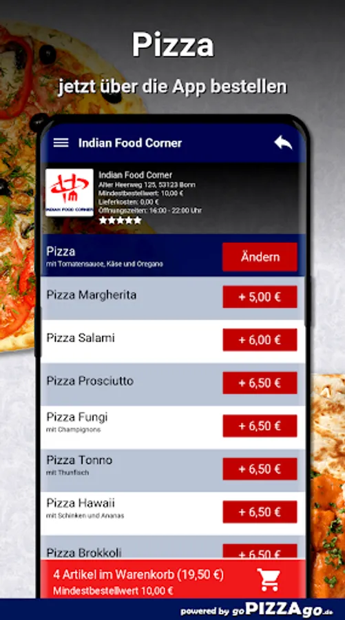 Enjoy pizza from the Indian Food Corner Bonn pizza delivery service like a gourmet. Of course, you can easily order fifteen pizzas here at Indian Food Corner. Spicy Pizza Capricciosa is delivered to you for 7.50 euros, Pizza Hawaii is delivered to your home for 6.50 euros, Pizza Caprese is brought to you for 7.50 €.