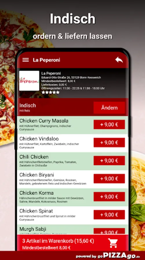Original Indian dishes at the La Peperoni delivery service in Bonn KessenichOur 25 delicious Indian dishes are an exquisite mixture of different spices with a unique taste. The delivery service brings you wonderfully seasoned chicken spinach at a price of 9 euros.