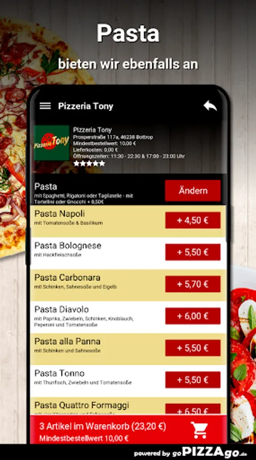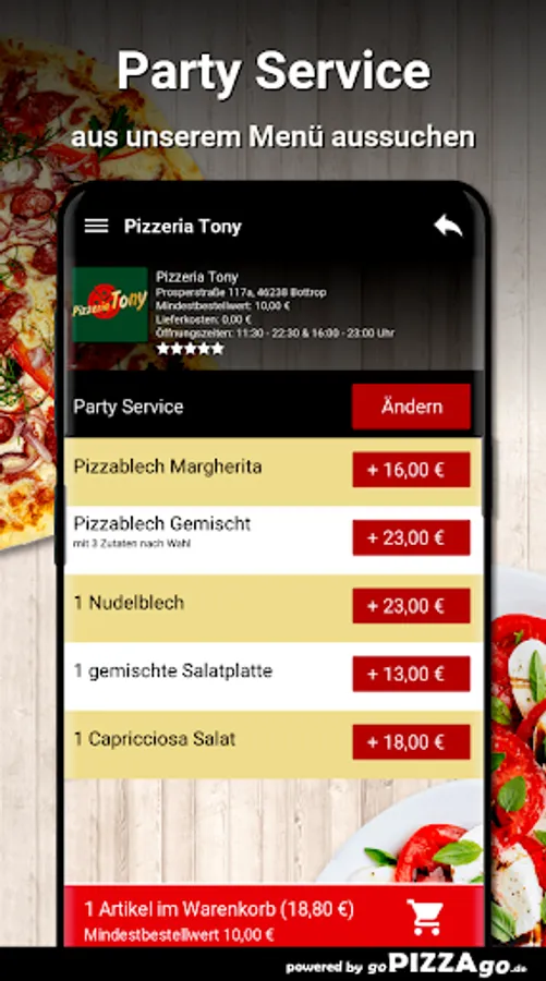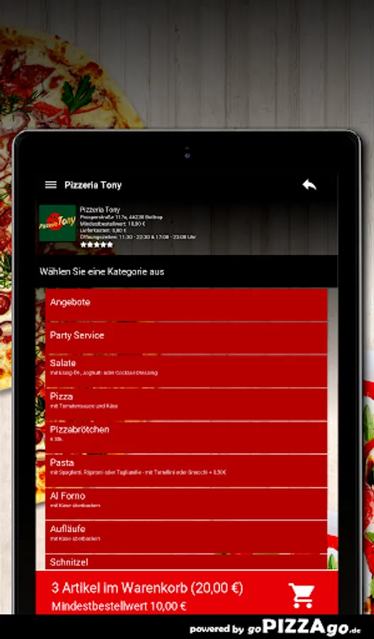 You can order a number of tasty dishes from the delivery service Pizzeria Tony (Prosperstrasse 117a in Bottrop) and have them delivered to your office or home. Choose from 193 foods or drinks (Pizza Salmone, Schnitzel with Chanterelles, Tortellini al Forno, Schnitzel Wiener Art or Pizza Romantica for € 4.00)