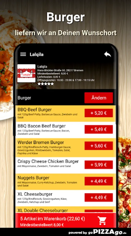 There are also very good burgers in Bremen at Lalqila! You can also order super delicious 8 fine burgers from our delivery service in Bremen, how about today with tasty and juicy Werder Bremen Burger will be delivered to your current one for 5.60 euros Delivery address, XL Cheeseburger, BBQ Bacon Beef Burger to your current delivery address, XL Double Cheeseburger can be delivered to you for € 7.99.