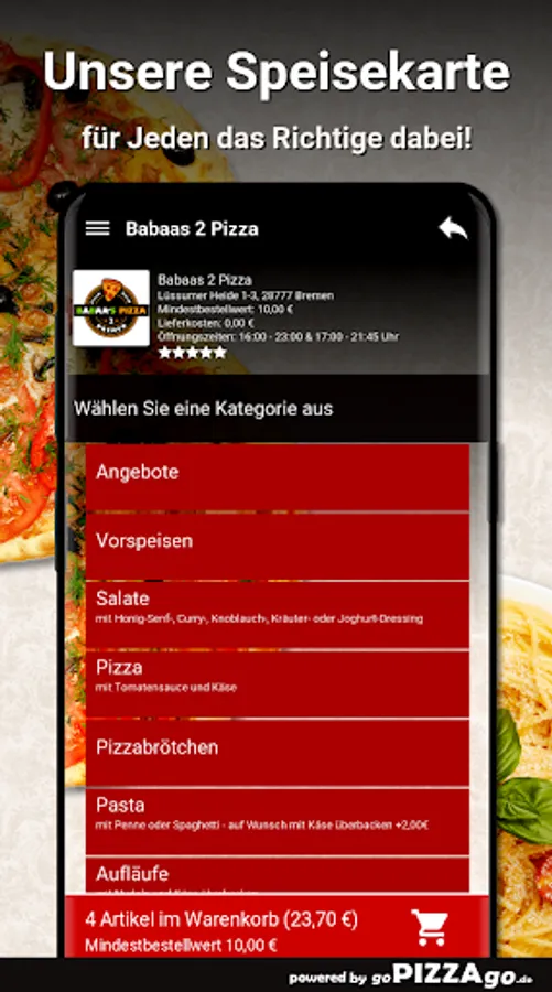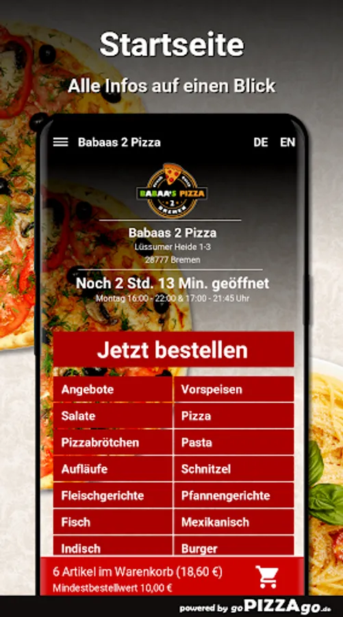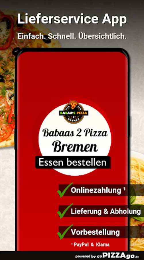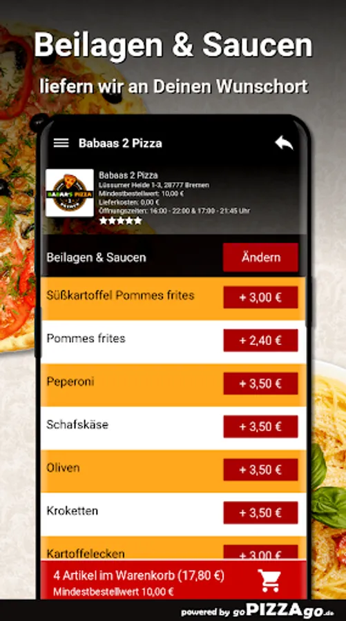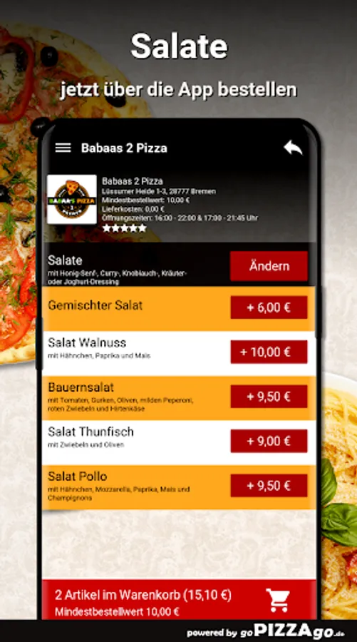 You can conveniently order and pay for deliciously prepared food online with the delivery service Babaas 2 Pizza (Lüssumer Heide 1-3 in Bremen). More than 169 freshly prepared dishes, herb sauce, pasta chicken curry, pizza kebab, salsa, 5 pizza rolls with sauce.The absolute hits at Babaas 2 PizzaWhen does Babaas 2 Pizza deliver?