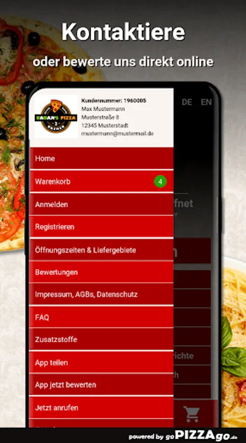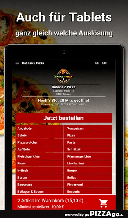 Longing for pizza from Babaas 2 Pizza Bremen? Surely something for your palate too .. discover our fresh pizzas too! Very good pizza turkey ham Funghi brings you the delivery service at a price of 8.50 to 14.00 €, pizza calzone tuna has Babaas 2 pizza for only 9.40 €, crispy baked and topped Pizza Extreme Cheese, Pizza Chicago , Pizza Italiano is delivered directly to your front door at a price of 9.50 to 17.40 euros. Original Pizza Mediterran has you Babaas 2 Pizza for only 10.00-17.40 € for convenient ordering, Pizza Tonno (8.50-14.00 €) and you get original Pizza Gamberoni with tomato sauce and cheese for 10.00 -€17.40.