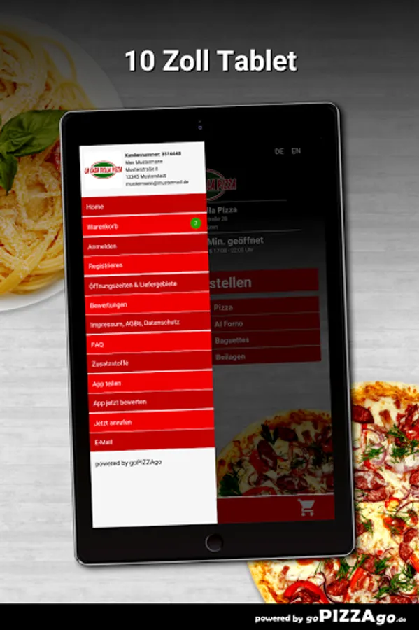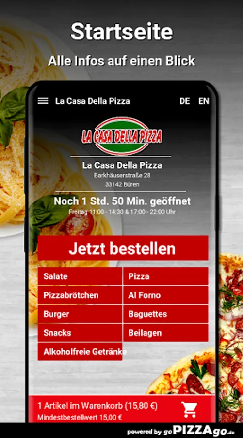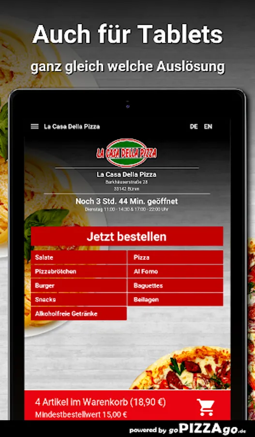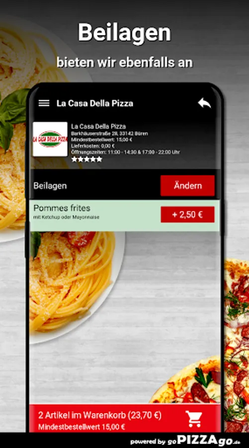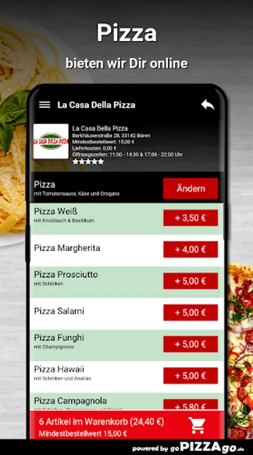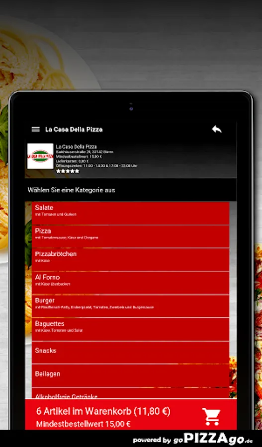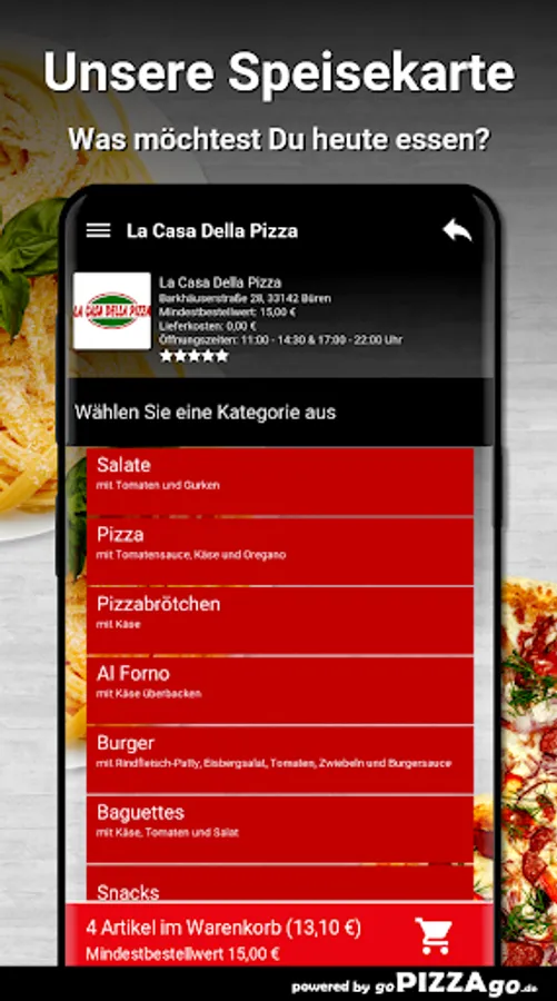 Food, freshly prepared and delivered hot, can be safely ordered from our pizza service here. Choose from 58 dishes, an extract from our menu: Rigatoni a la Bolognese al Forno, Double Burger, Spaghetti Bolognese al Forno, Baguette Panino al Tonno, Insalata Contadina, Tomato Salad, Pollaio Salad, Pizza Margherita for € 5.50 We are very happy to order online! The opening times