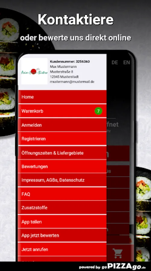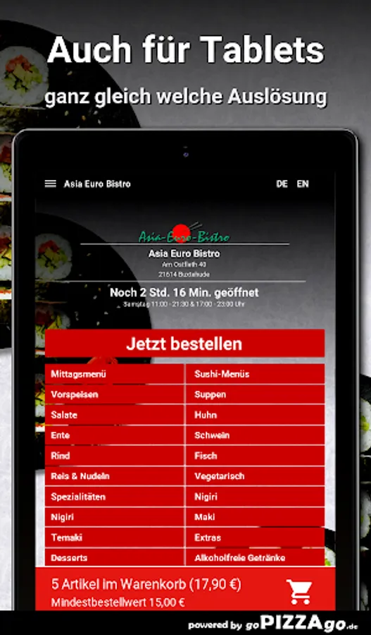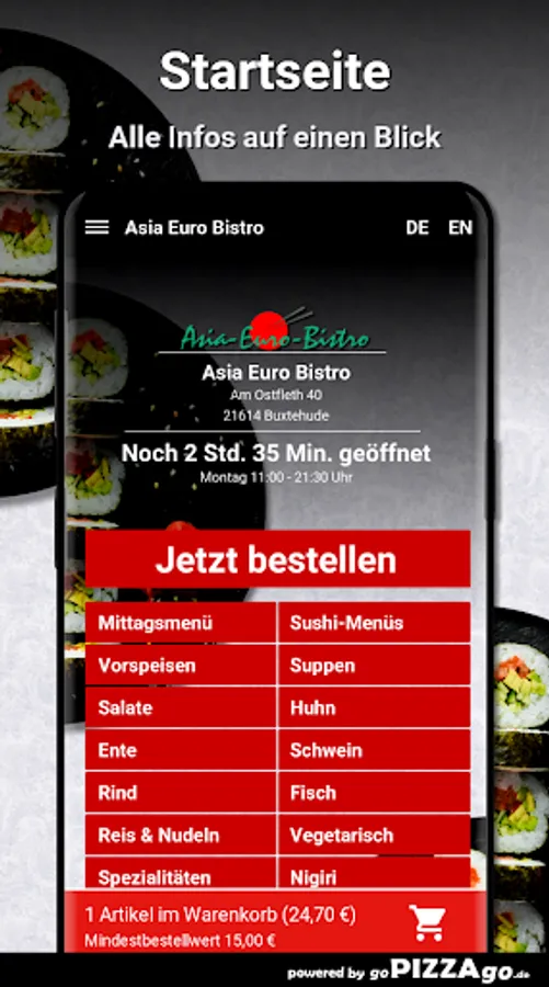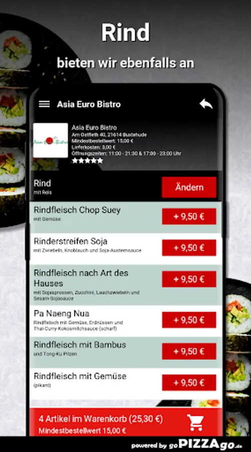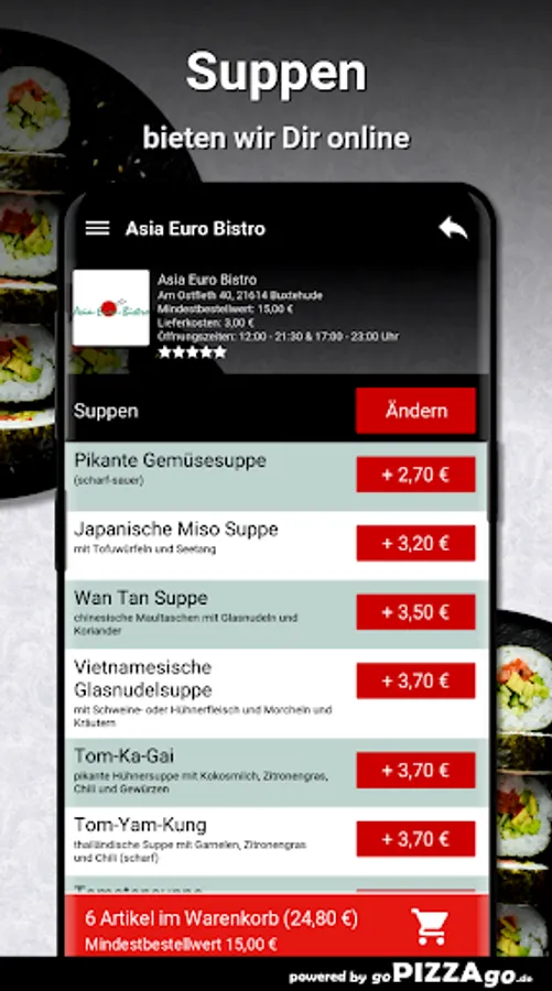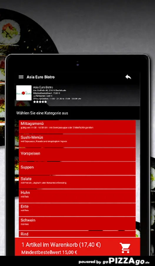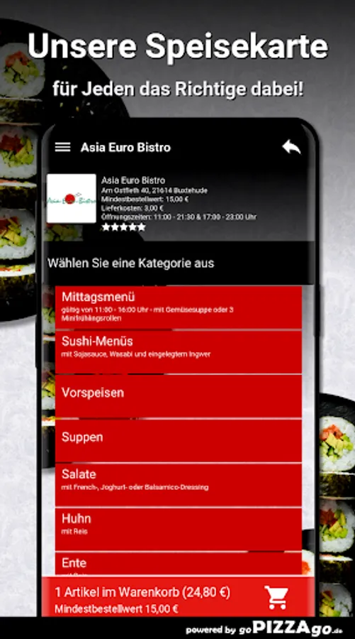 You can order tasty prepared food with our delivery service with ease and have it delivered quickly. You will find over 210 delicacies in our menu. We continue to deliver thirst quenchers such as Coca-Cola light, Fanta, Coca-Cola, Mezzo Mix, guava juice. Our offers for your lunch break: Lunch menu 1, lunch menu 13, lunch menu 4, lunch menu 12, lunch menu 17, lunch menu 16. The top sellers at Asia Euro Bistro The delivery times of Asia Euro Bistro