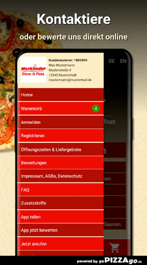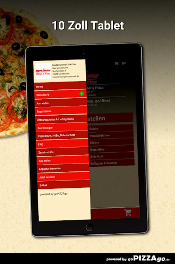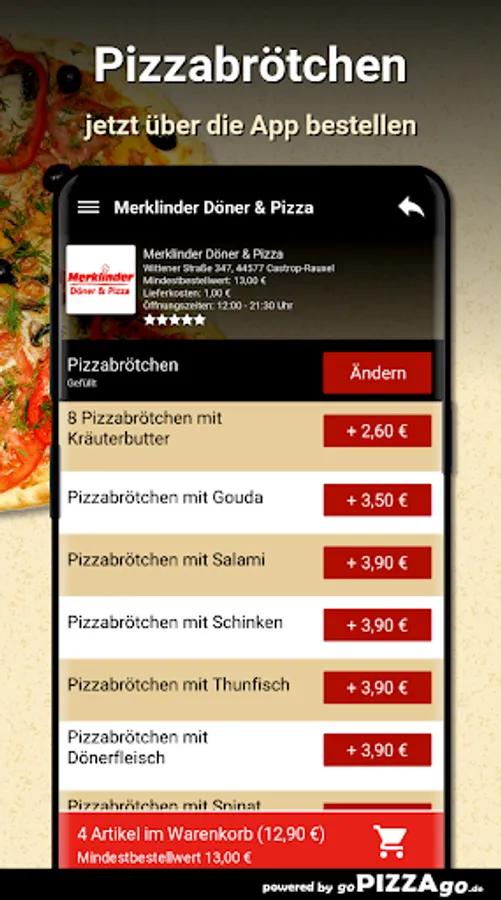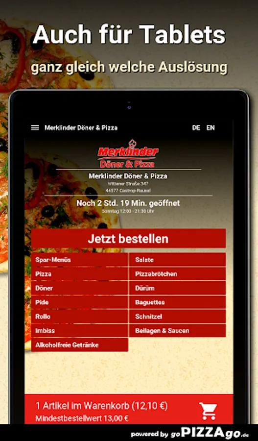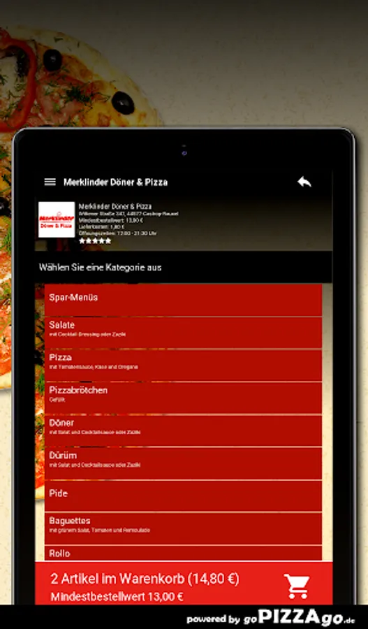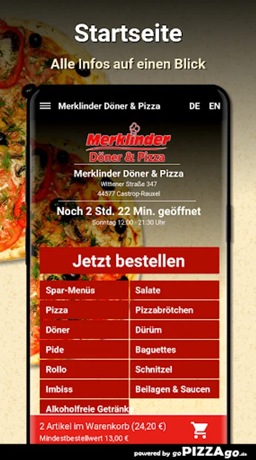 You can order freshly prepared food quickly and conveniently online in our pizza service. A fresh selection of 132 freshly prepared dishes awaits you (salad tonno, french fries, hot chicken burger, pizza rolls with sucuk, pide with Gouda, pizza rolls with spinach and feta). Our 7 top hitsWe deliver at these times