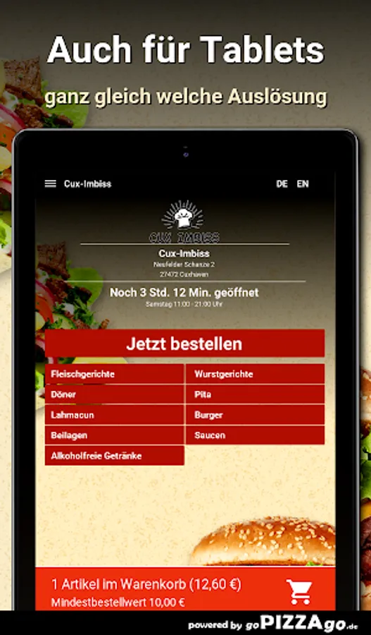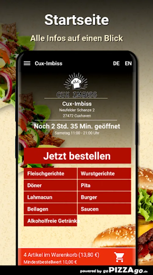 Cux-Imbiss - order delicious fresh dishes onlineWe have lahmacun, sausage dishes, burgers, doner kebabs, sauces, meat dishes, and pita to order and of course have them delivered as quickly as possible.