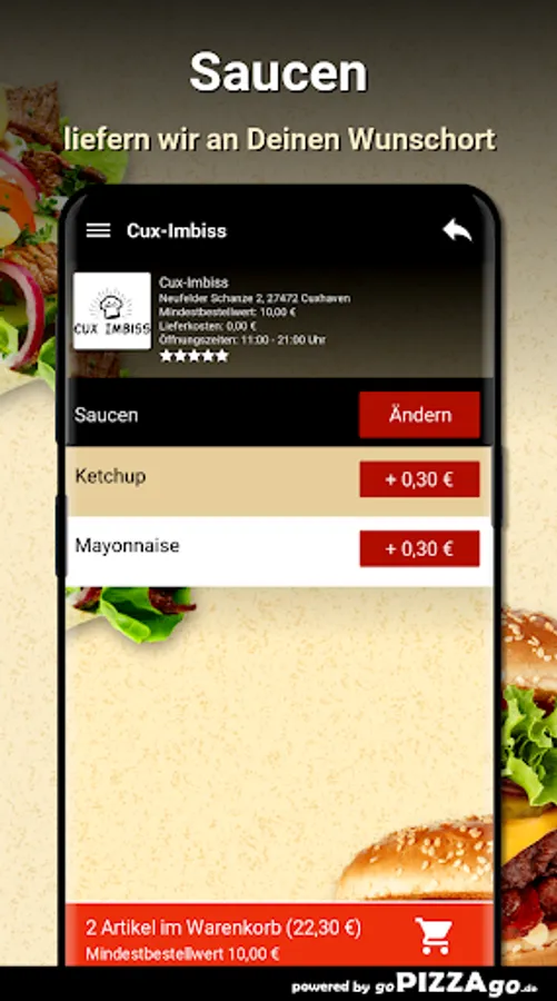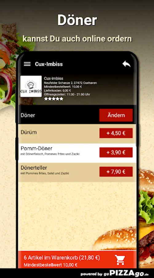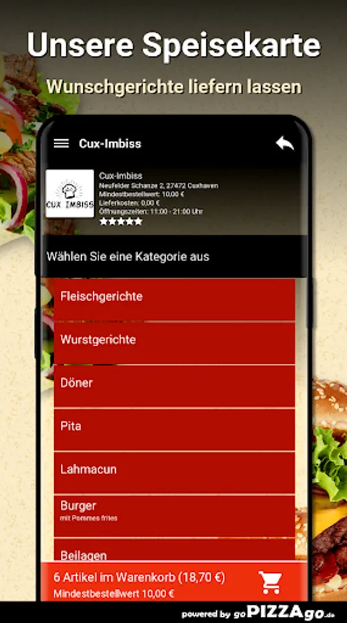 You can easily order a wide variety of tasty specialties online from the Cux-Imbiss delivery service (Neufelder Schanze 2 in Cuxhaven). You can look forward to an absolutely tasty range of 32 dishes and drinks. What do customers find most delicious? We deliver quickly at the following times
