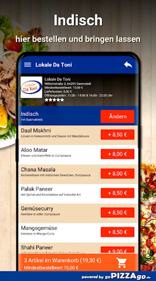 If you want to order delicious, varied Indian dishes at Local Da Toni in Darmstadt, our 23 varied Indian dishes are an exquisite blend of fresh spices with a unique taste. Mango vegetables are available for € 8.50, Tandoori can be ordered for € 9.50, Shahi Paneer, Tikka Masala can be ordered for € 9.50, Palak can be ordered for € 8.50, Mango as delivery to the place Your choice, Rogan Josh, fine Pizza Chili Chicken, Pizza Bombay Chicken will be delivered to your home at a price of 7.00-19.50 € and Madras will bring you the delivery service at a price of 9 €.