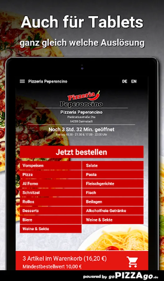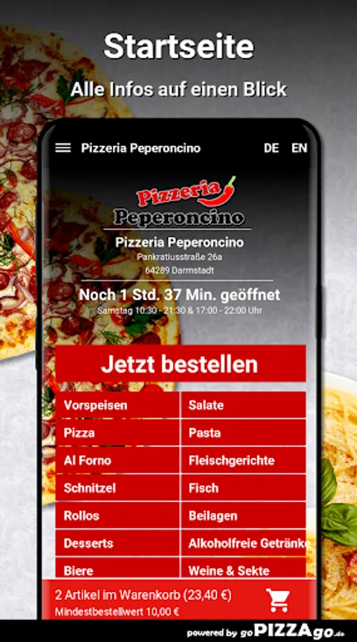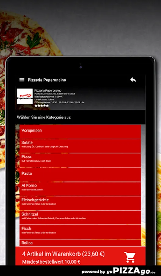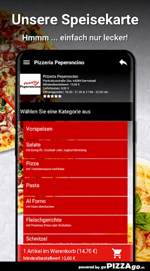 You can order hearty delicacies quickly and securely online from the delivery service Pizzeria Peperoncino (64289 Darmstadt). A variety of 194 delicious dishes such as Lasagne Melanzane, Mushroom Schnitzel, Rollo Vegetarian, Bistecca al Pepe Verde, Pizza Funghi Salami or Rollo Ham Peperoni Sausage for 7.50 euros. Customers will find the following specialties the bestOur opening times