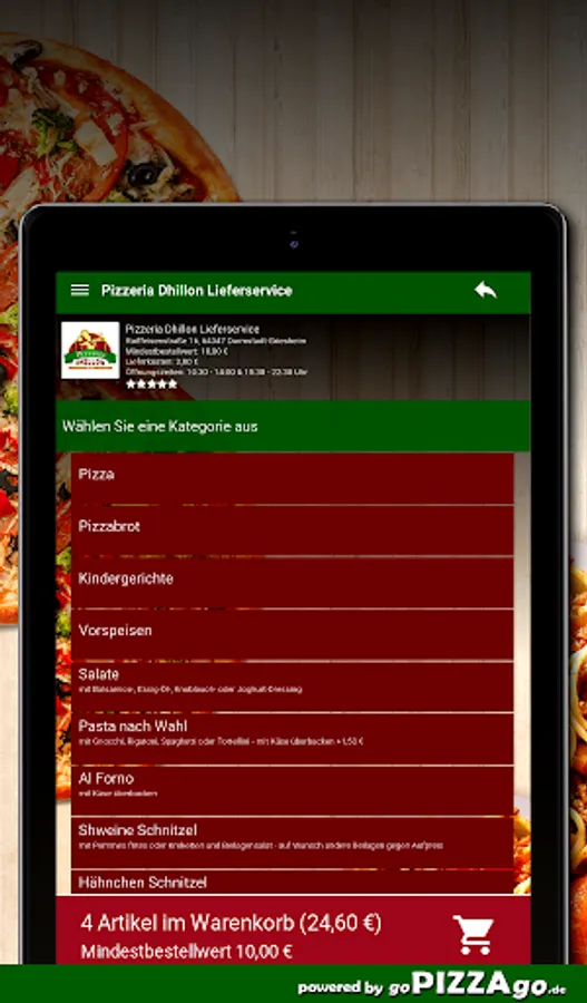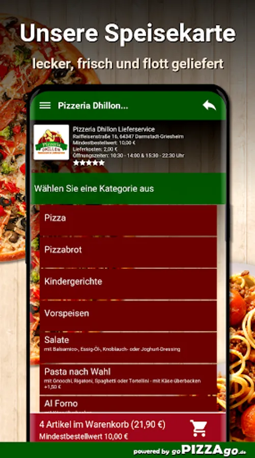 At Pizzeria Dhillon delivery service you can easily order Al Forno, pasta of your choice, grilled chicken fillet, starters, salads, pizza, snack & fast food, chicken schnitzel online and have it delivered.