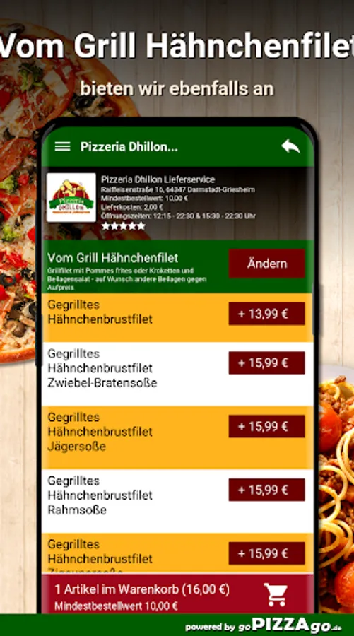 Chicken Gorgonzola schnitzel, excellent pork dhillon schnitzel is available for € 13.99-15.99, pork Bolognese schnitzel with french fries or croquettes and side salad - if you wish, you can have other side dishes for an additional charge of 13.99-15.99 euros, Viennese-style chicken schnitzel is available At Pizzeria Dhillon delivery service for 10.99 to 12.99 € or you can get really good pork mushroom cream schnitzel with mushrooms in cream sauce for 0.00-15.99 €.