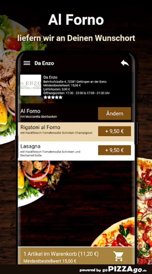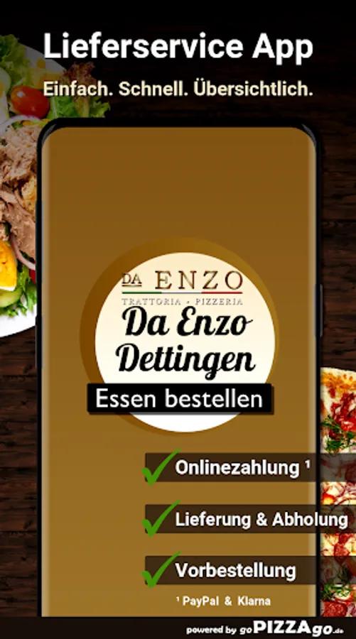 You can order good pasta specialties here conveniently online from Da Enzo. Tagliatelle ai Gamberi, Rigatoni 4 Formaggi are available from Da Enzo for € 8.50. Spaghetti Frutti di Mare is available for € 11.90, Spaghetti Carbonara can be ordered for € 9, and delicious penne al pesto is brought to you for € 7.50.