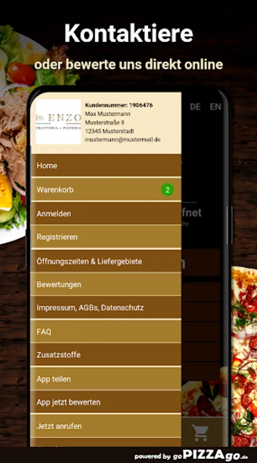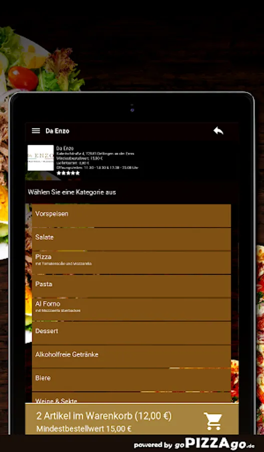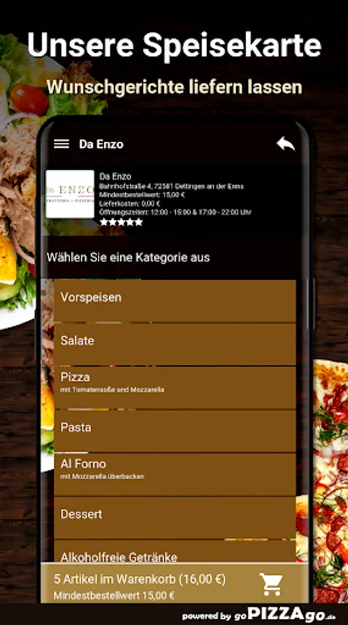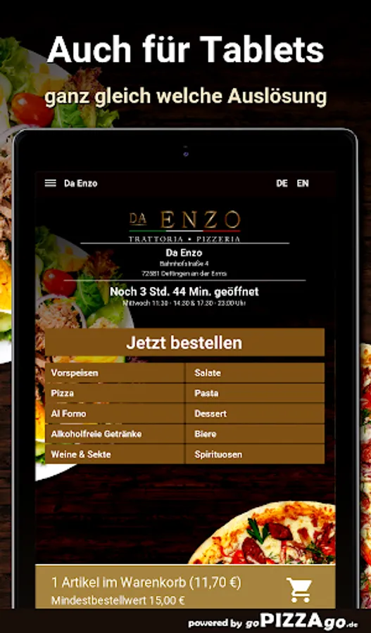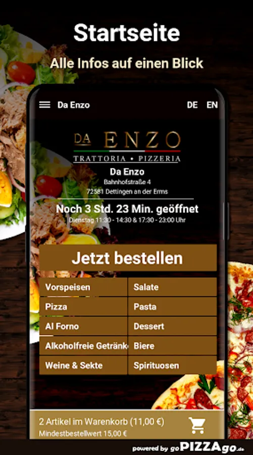 You can order delicious dishes and dishes online from the Da Enzo delivery service (72581 Dettingen an der Erms). Of course, you can look forward to a delicious range of over 110 dishes, including Insalata Enzo, Pizza Hawaii, Pizza Carciofi, Antipasto di Verdure, Pizza Frutti di Mare.