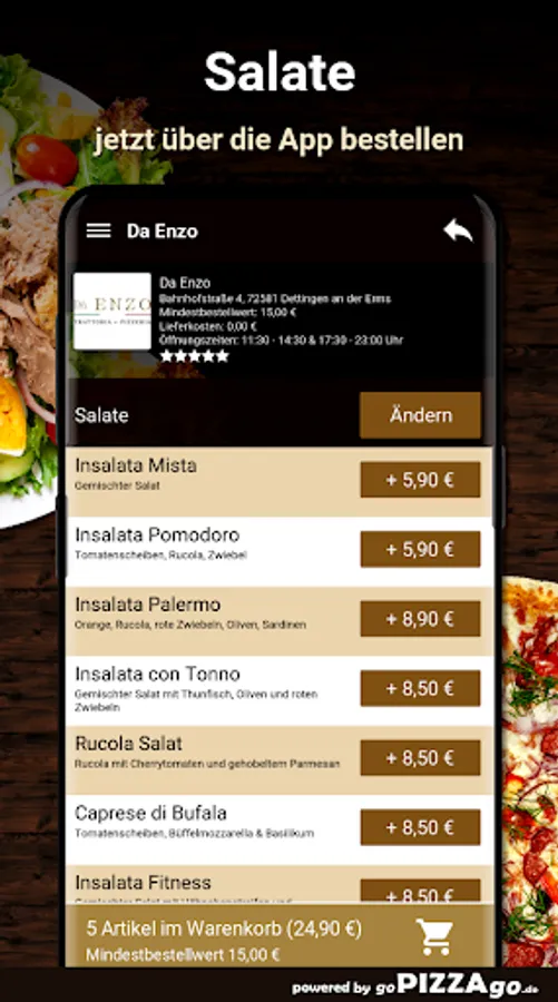 The salad dishes at Da Enzo are a healthy experience. We offer you 8 salads. You can get Insalata Enzo at Da Enzo for 12.90 €, you can get Insalata Mista here online for just 5.90 €, the best Insalata Pomodoro here online for just 5.90 €, Insalata Fitness & Caprese di Bufala is available from Da Enzo for € 8.50. Your Da Enzo team in 72581 Dettingen an der Erms