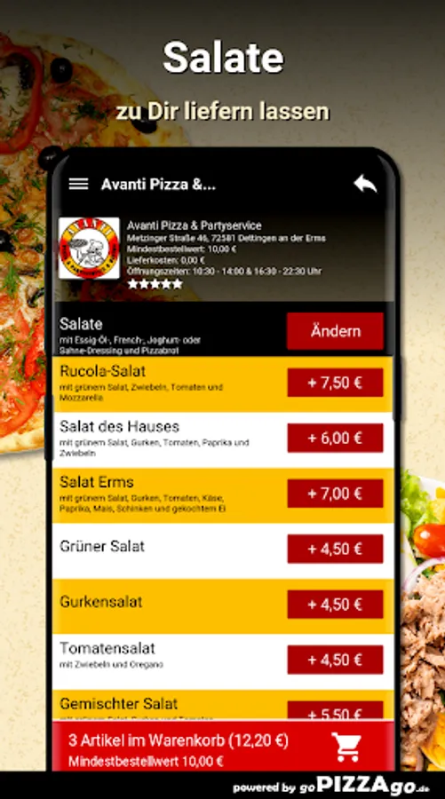 You can order really tasty meals from the delivery service Avanti Pizza & Partyservice (72581 Dettingen an der Erms) quickly and safely online. We have 277 dishes, of course, an extract: 2 cordon bleu, pizza gyros, pasta with 3 types of meat, 2 baguettes Ermstal. Or of course the lunch menus such as lunch 1 - pizza 30cm (EUR 7.90), lunch - pasta gratinated (EUR 8.40), lunch - salad (EUR 6.90), lunch - 2 pork schnitzel (EUR 7.90). As a dessert we offer: Tartufo tartlets, spaghetti ice cream, magnum, baked banana, half coconut, tiramisu. You can also order soft drinks: Red Bull, Fanta, orange juice, water. What do customers like the most? The opening times