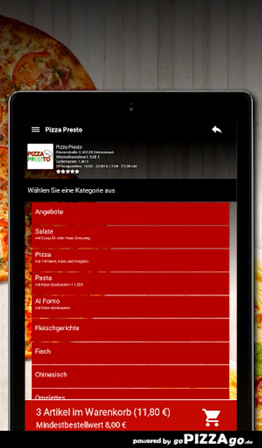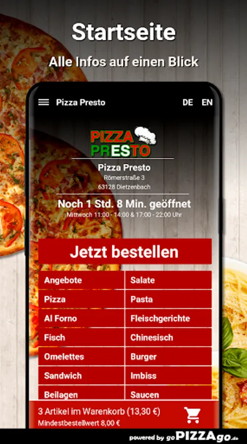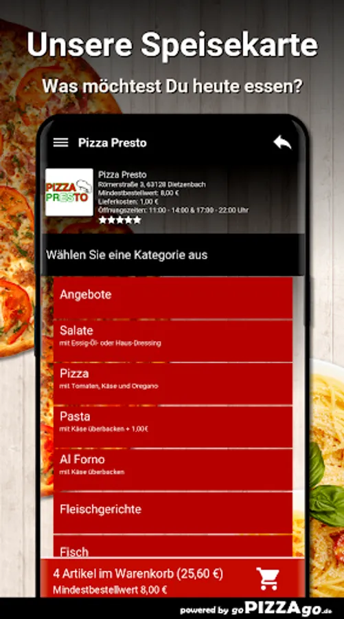 Welcome to Pizza Presto - your delivery service for fish, pizza Are you hungry for Al Forno, salads, meat dishes, Chinese, burgers, pasta, pizza, snacks to order online?