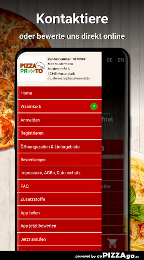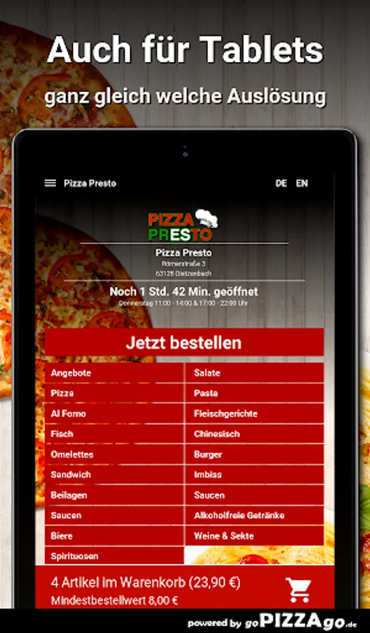 Enjoy pizza from Pizza Presto Dietzenbach like a connoisseurGeniale (42 in number) You can order pizzas here without any problems. Pizza Napoli with shrimps, garlic and onions, pizza prosciutto is delivered at a price of 5.50-19 €, pizza mozzarella ham, delicious topped pizza Casanova with tomatoes, cheese and oregano to your home or anywhere else, pizza artichokes 6.00-21 , 00 €, Pizza Puglia with tomatoes, cheese and oregano. Your Pizza Presto team