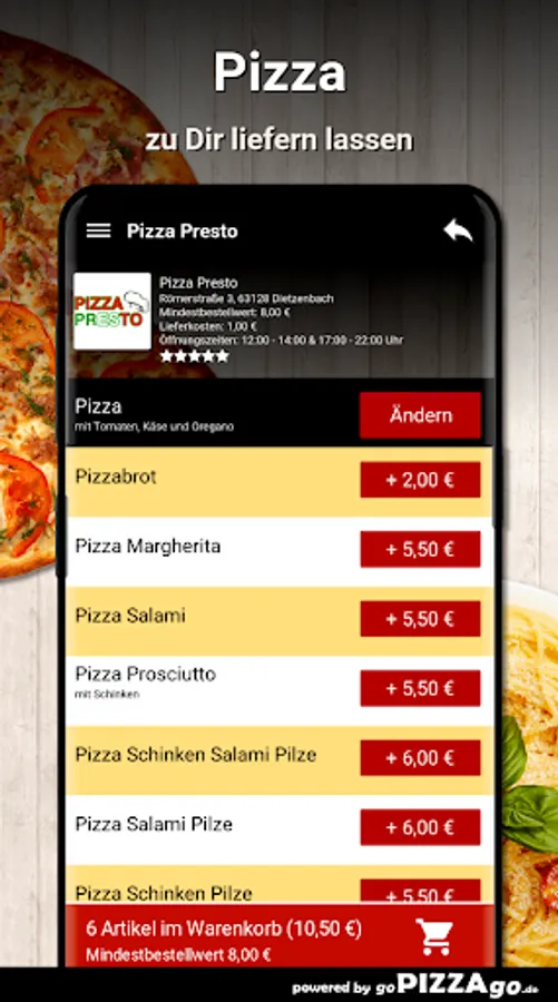 You can easily order a variety of fine meals from our Pizza Presto delivery service in Dietzenbach and have them delivered quickly. We have 179 delicious dishes such as Schnitzel Bolognese, Tagliatelle 4 cheese, Rigatoni chicken breast strips, Pizza Valentino, Onion Schnitzel, 10 Cevapcici or Pizza Sophia Loren for 6.50 euros. The top 7 hits here: Pizza Presto has the following times open