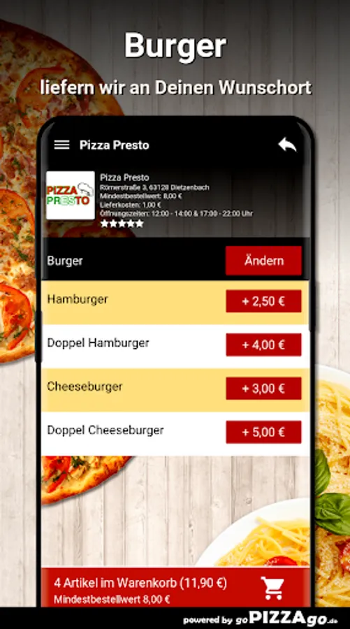 Burger fryers like Pizza Presto in Dietzenbach also deliver delicious burgers & Co. At Pizza Presto you can also feast on good burgers in different variations. Cheeseburgers, double hamburgers are delivered to you for € 4, double cheeseburgers (€ 5.00) and hamburgers (€ 2.50).