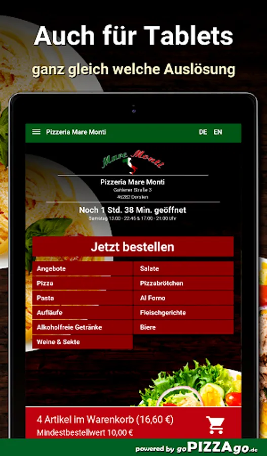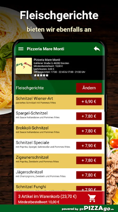 Hungry for pizza in Dorsten? Then you have come to the right place at Pizzeria Mare Monti. 59 pizzas can be easily ordered online with your friends at Pizzeria Mare Monti. Original Pizza Pescatore is available online for only € 5.20-6.50, you can get pizza broccoli at Pizzeria Mare Monti for € 4.10-5.50, pizza hollandaise from € 3.90-5.20 & pizza Funghi (€ 4.10-5.20).