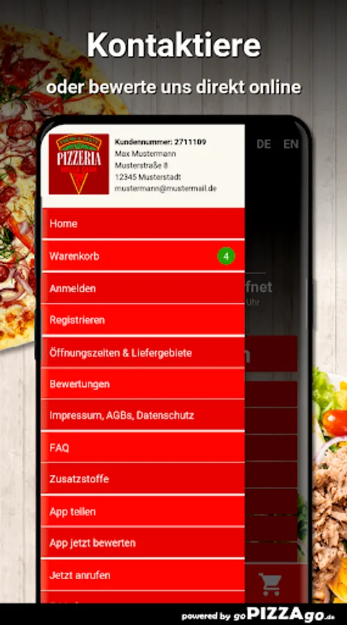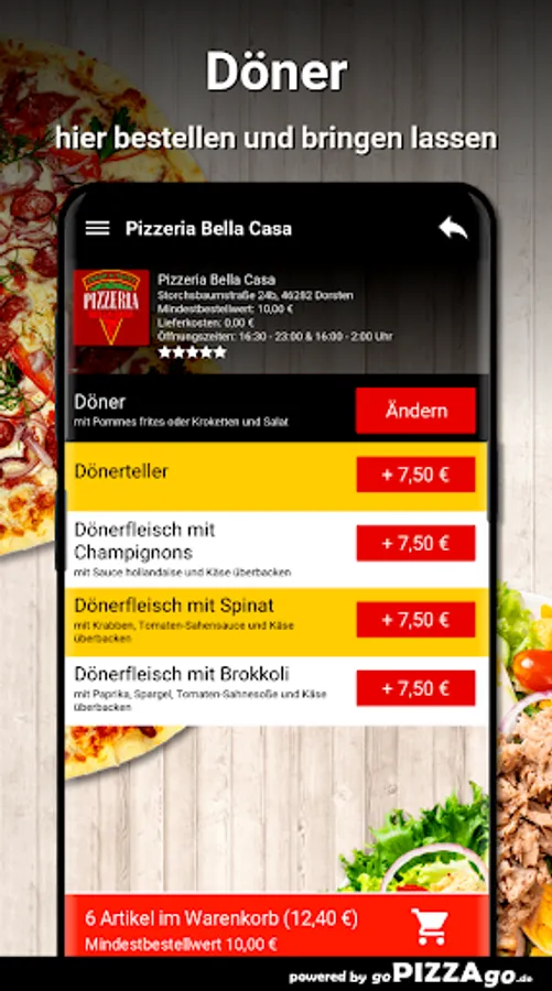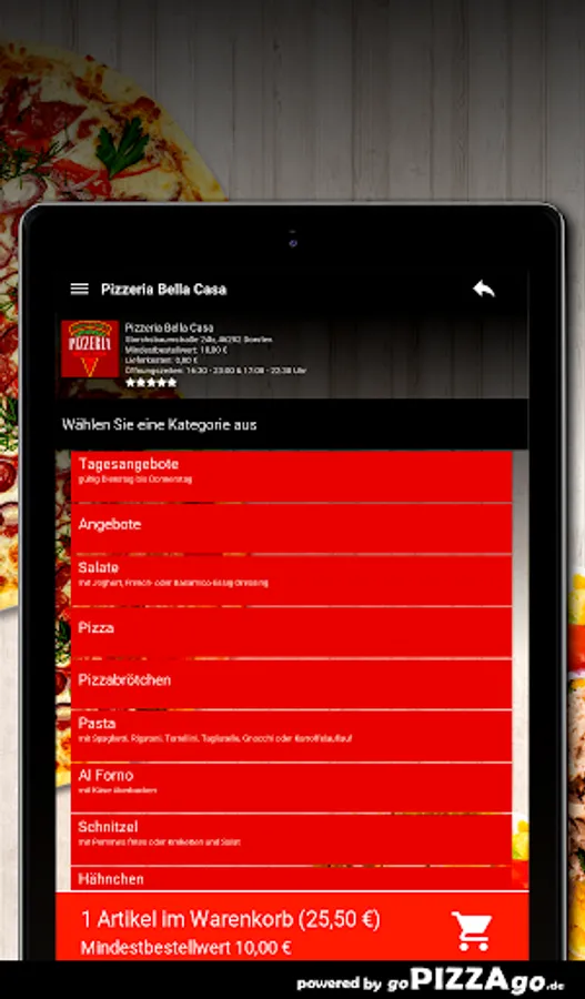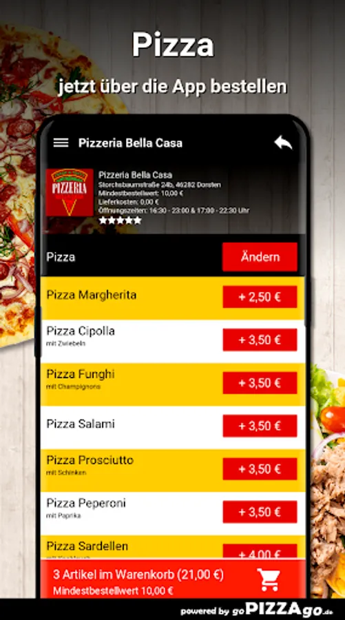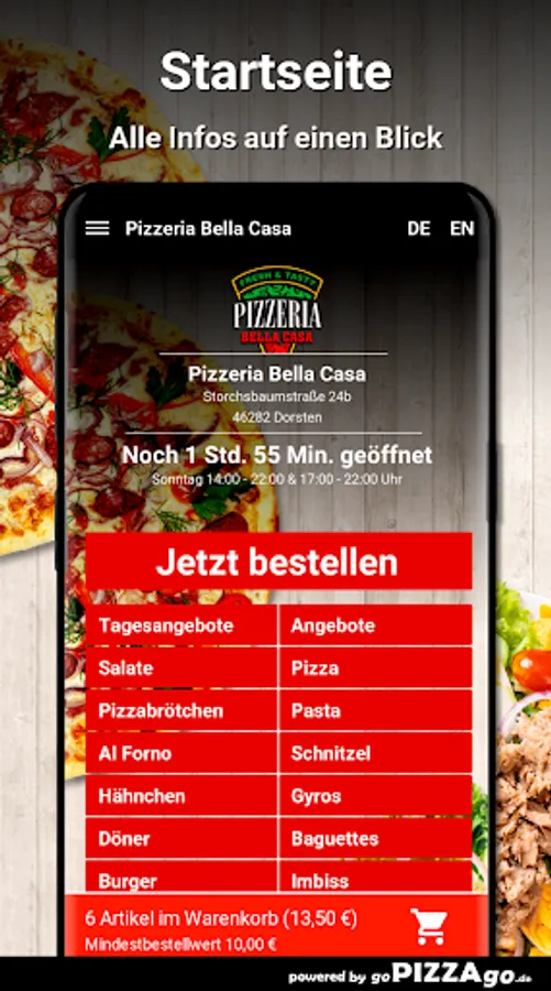 You can order and have it delivered quickly and easily from a deliciously fresh selection of food in our pizza service. What can we offer you? 156 fresh dishes such as Pizza Hollandaise doner meat onions, Pizza Roma, Pizza Calzone Nice, Pizza Jannes as well as Pizza Chef Spezial for 10.50 €. Our bestsellersThe delivery times of Pizzeria Bella Casa