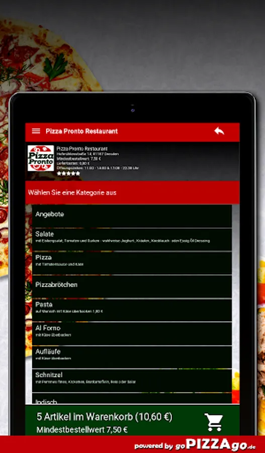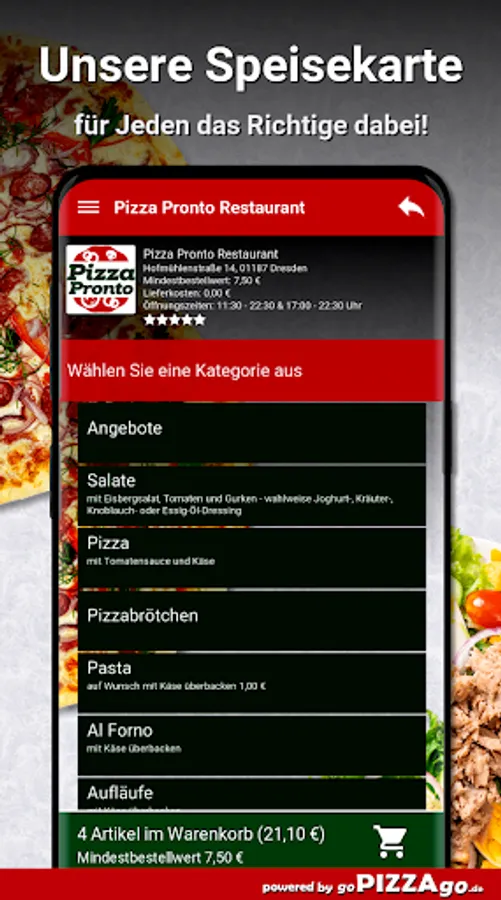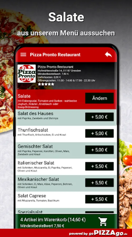 Salad: You can get well-seasoned at the Pizza Pronto Restaurant delivery service in Dresden The salad dishes at Pizza Pronto Restaurant are a healthy experience. We offer you thirteen salads. Italian salad (5.50-7.50 euros), special salad for 6.00-8.00 €.
